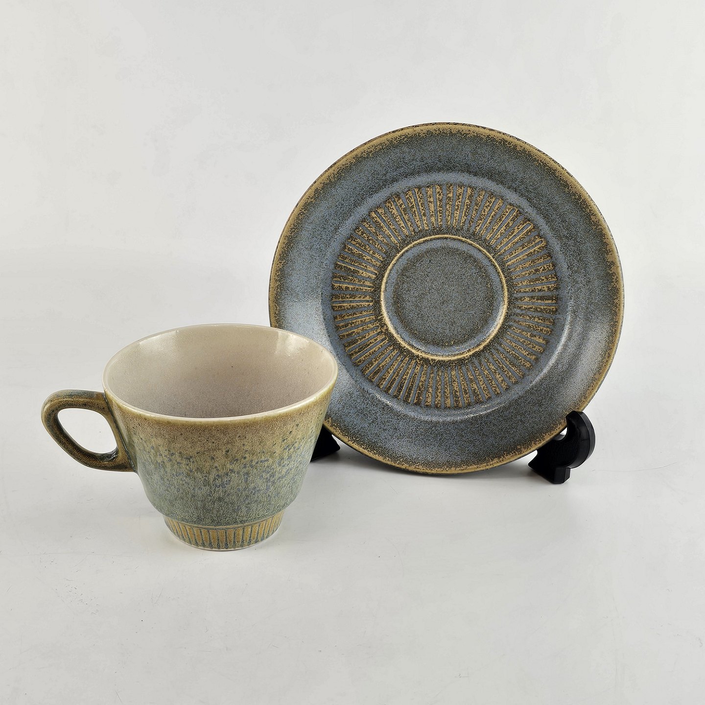 Kaffekop og underkop af stentøj og dekoreret med en grønlig nuancefarvet glasering.