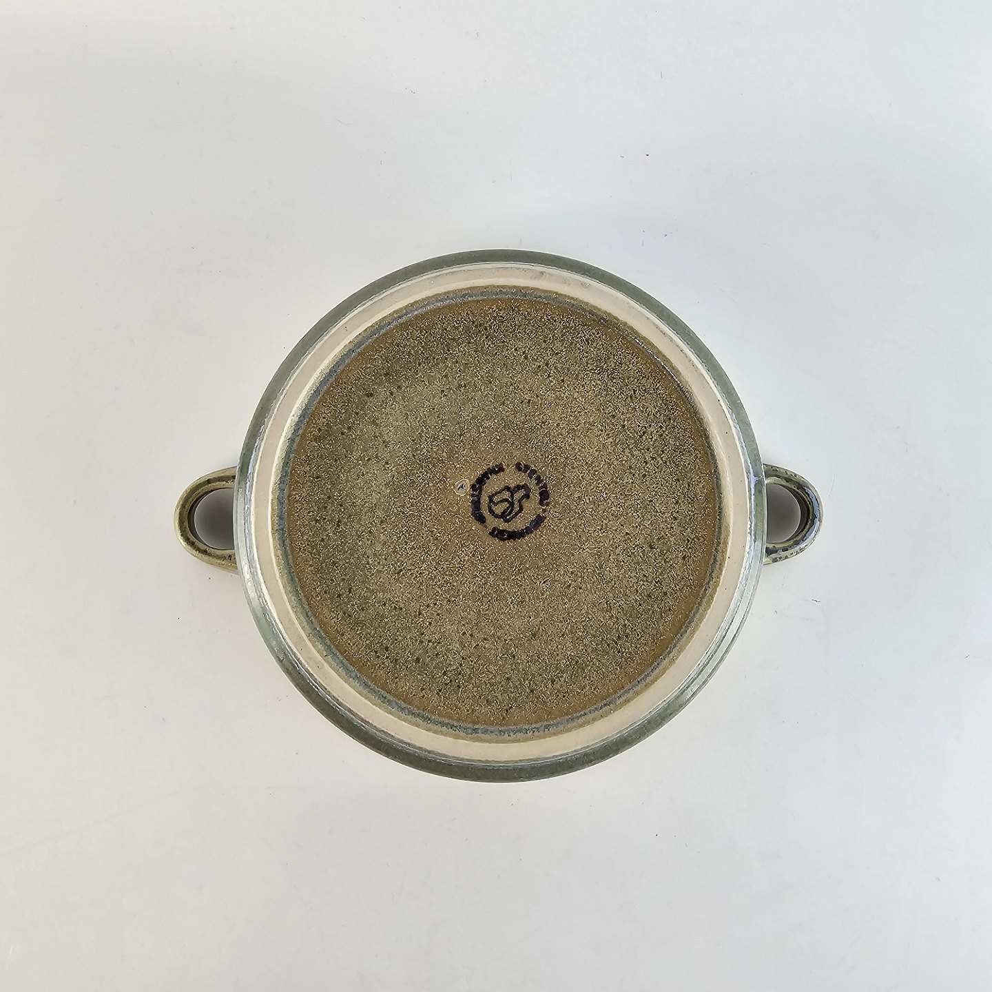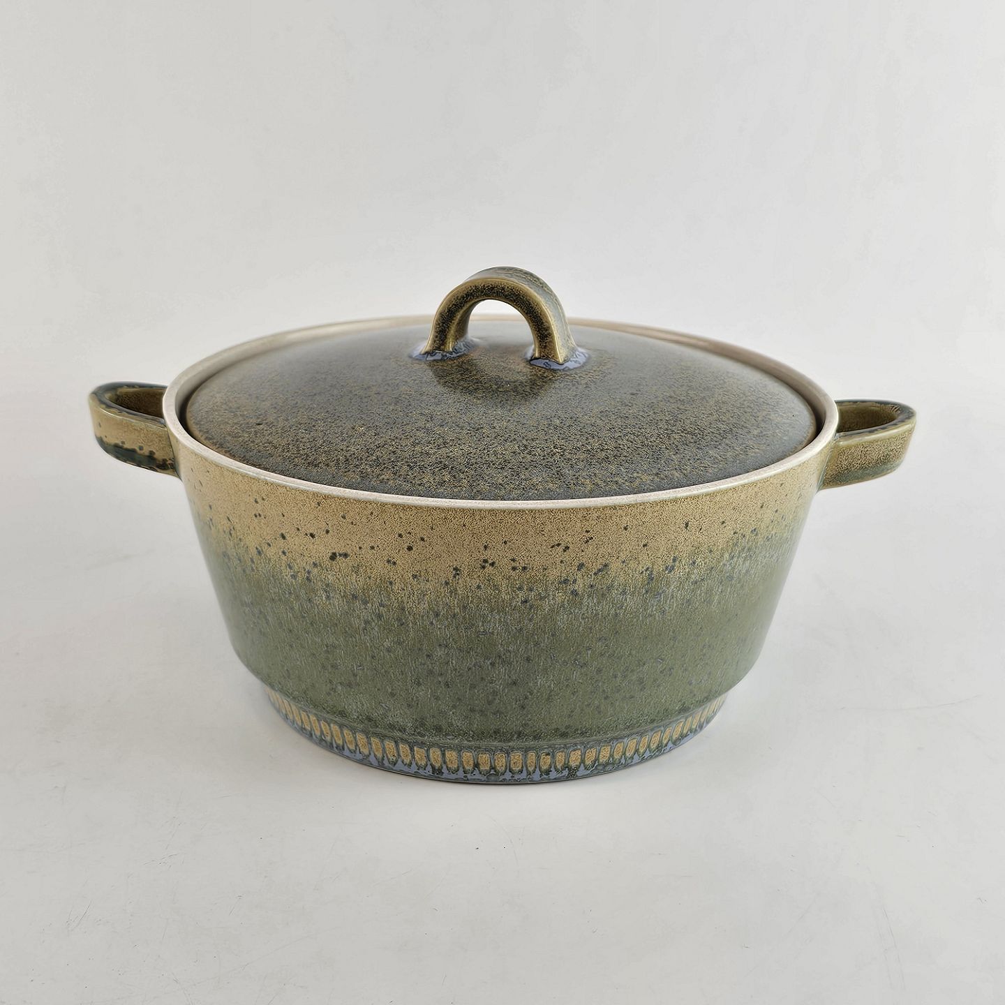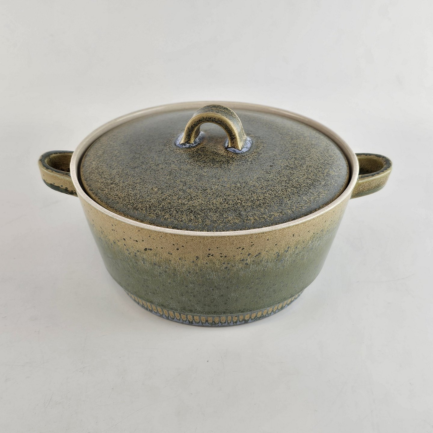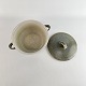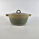 Skål med låg af stentøj og dekoreret med en grønlig nuancefarvet glasering.
