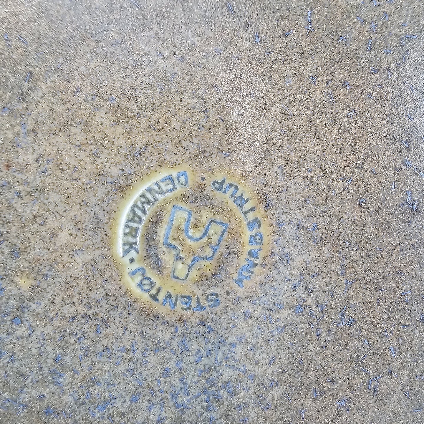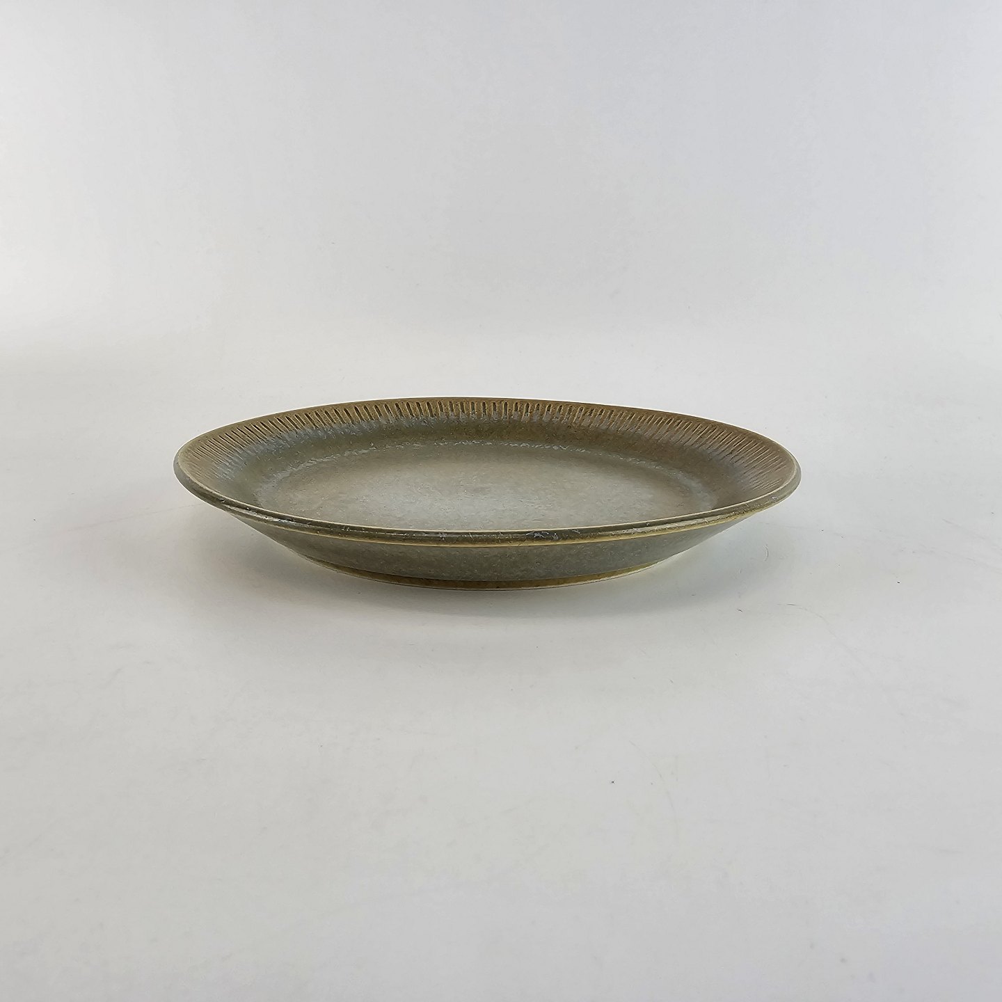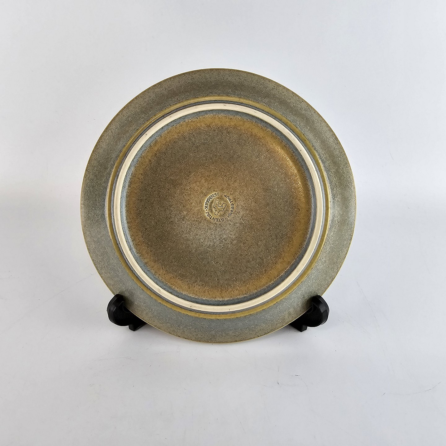 Tallerken af stentøj og dekoreret med en grønlig nuancefarvet glasering.