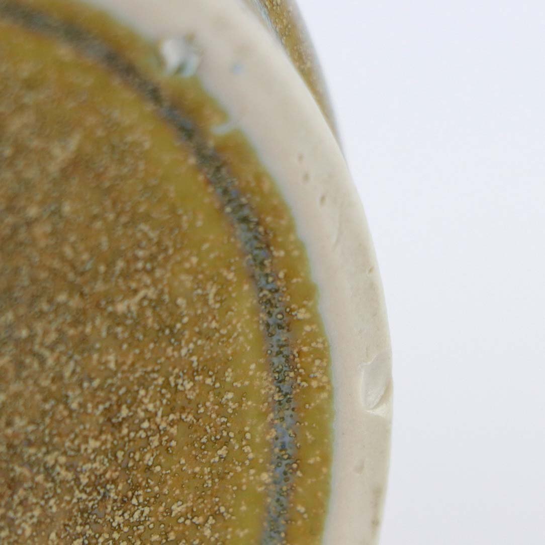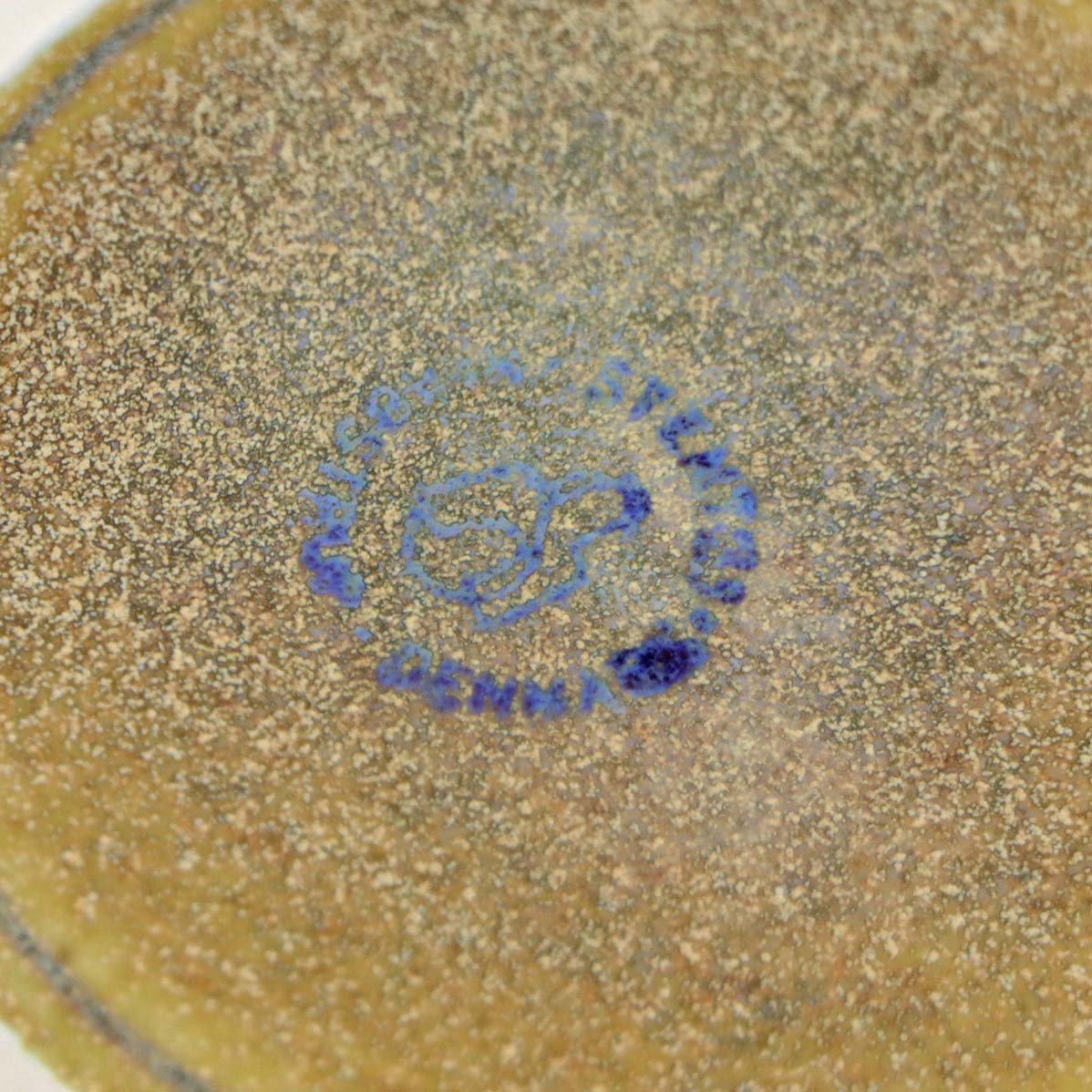 Skål med låg af stentøj og dekoreret med en grønlig nuancefarvet glasering.