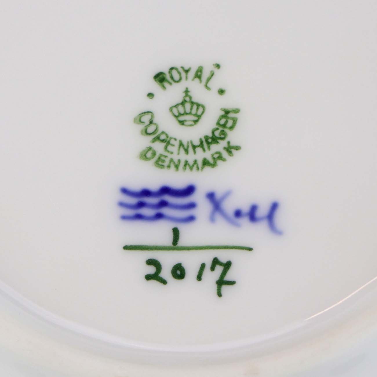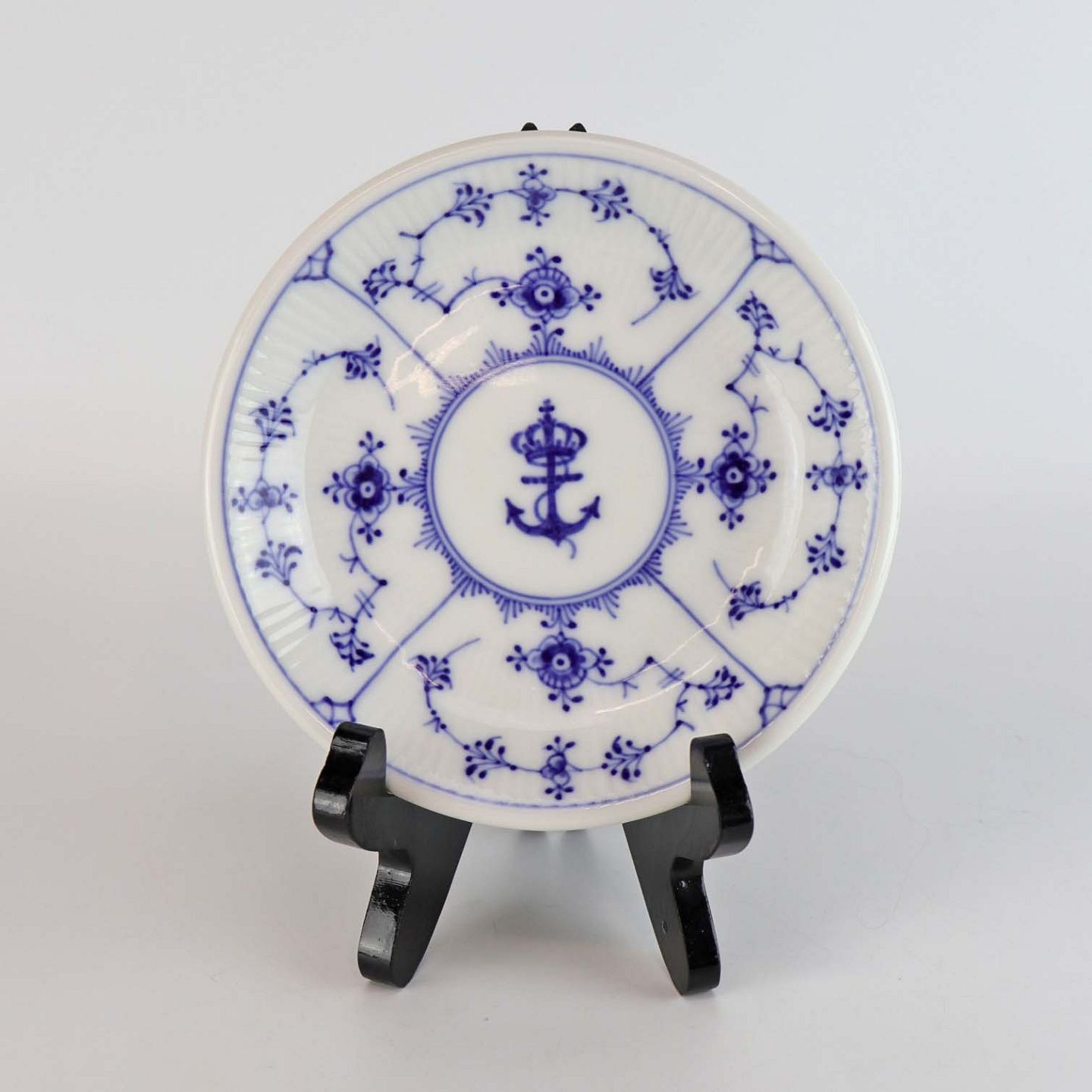 Kongelig sidetallerken i porcelæn med motiv af anker og krone fra stellet Musselmalet Riflet Hotelporcelæn nr. 1/2017