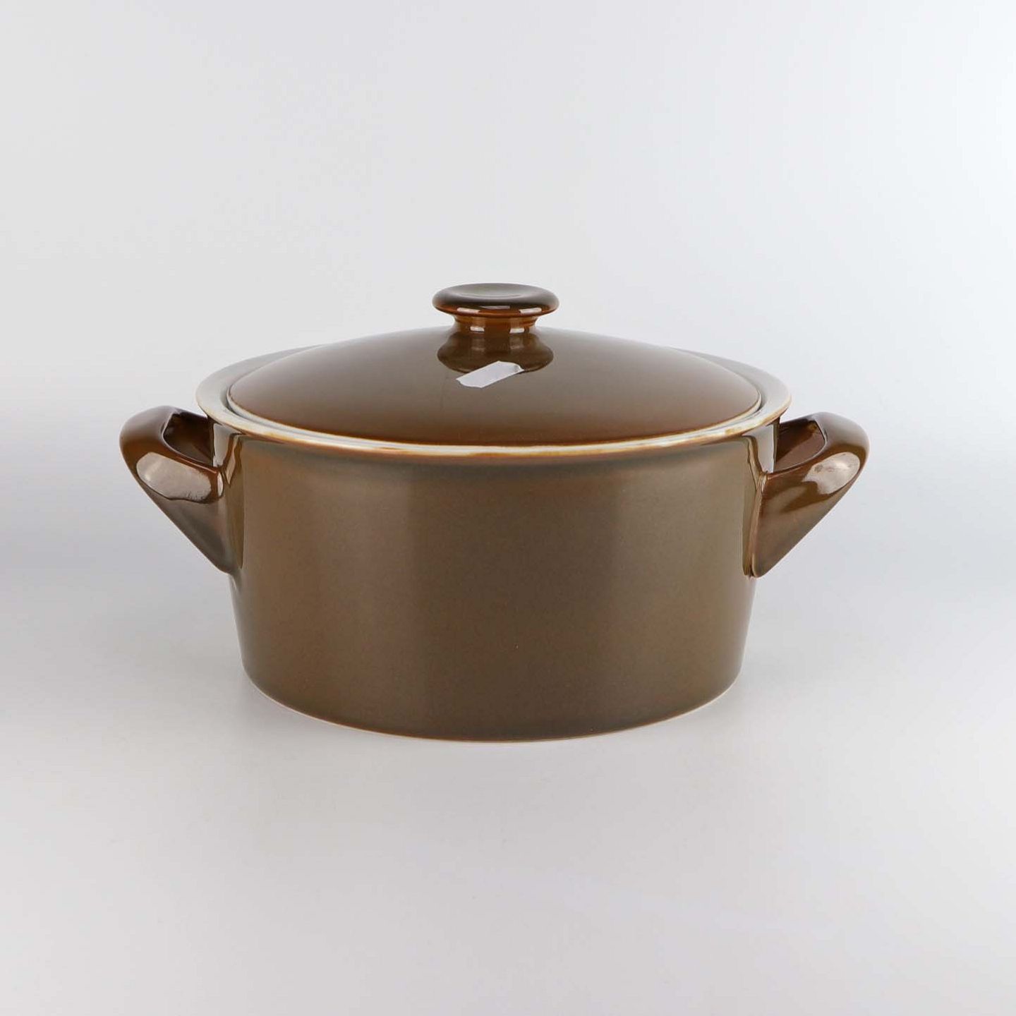 Stel i hvidt porcelæn med brun glasur på ydersiden.