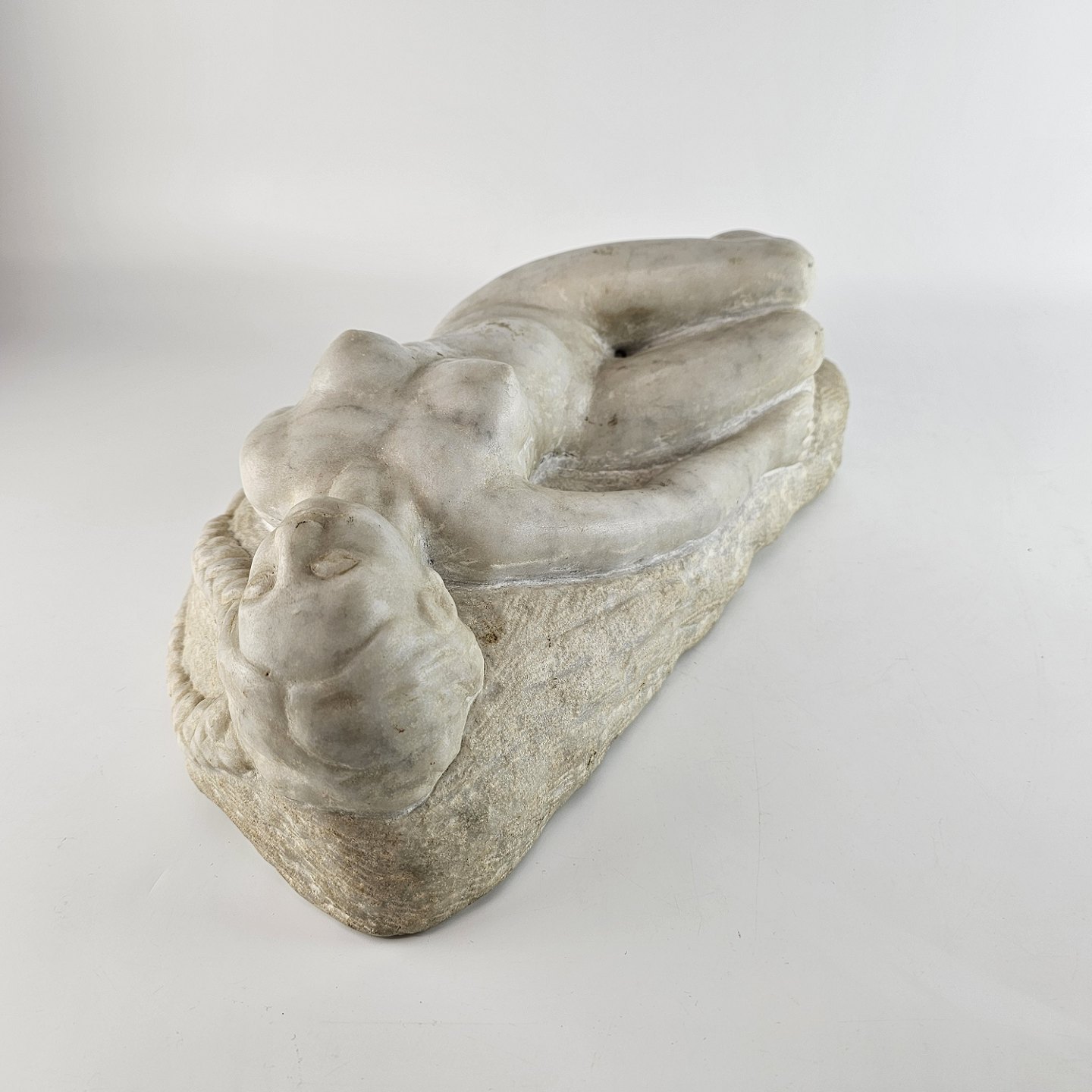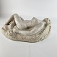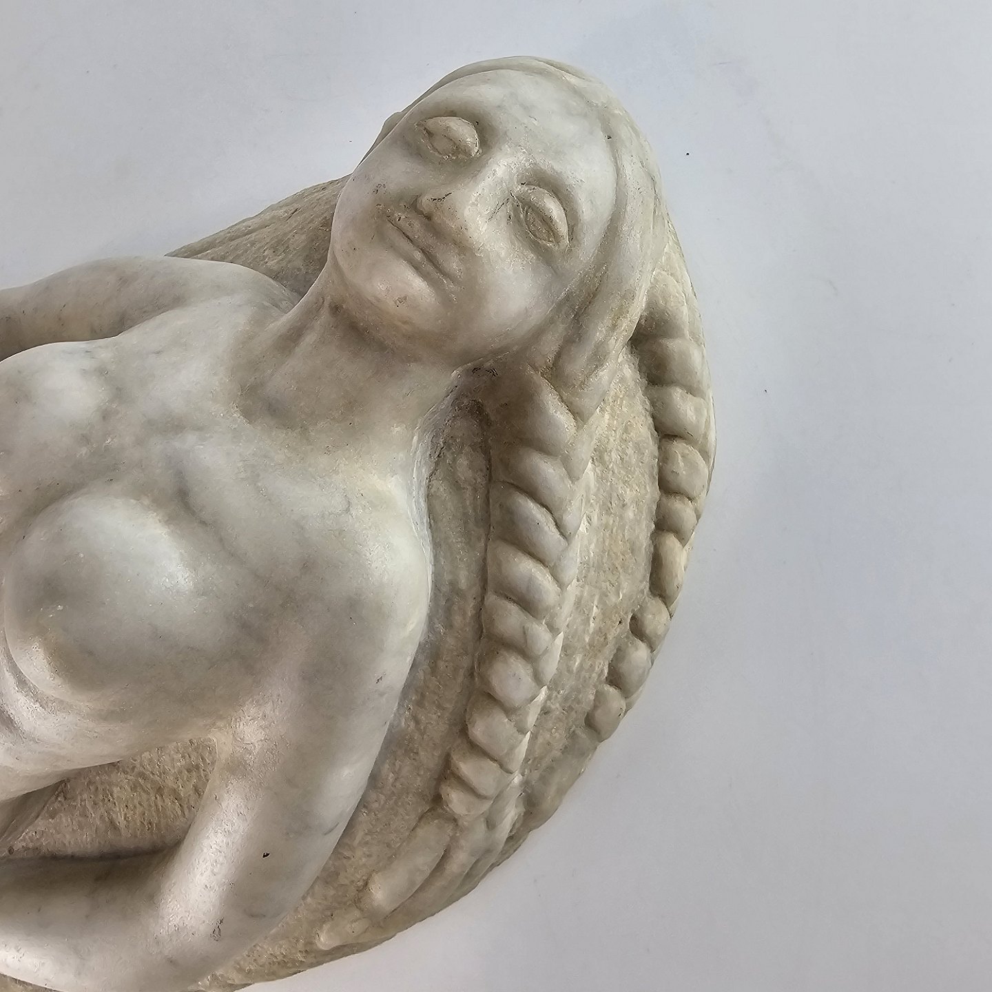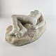 Svensk skulptur i massiv marmor med motiv af liggende kvinde med lange fletninger. Titlen Kvinna med flator