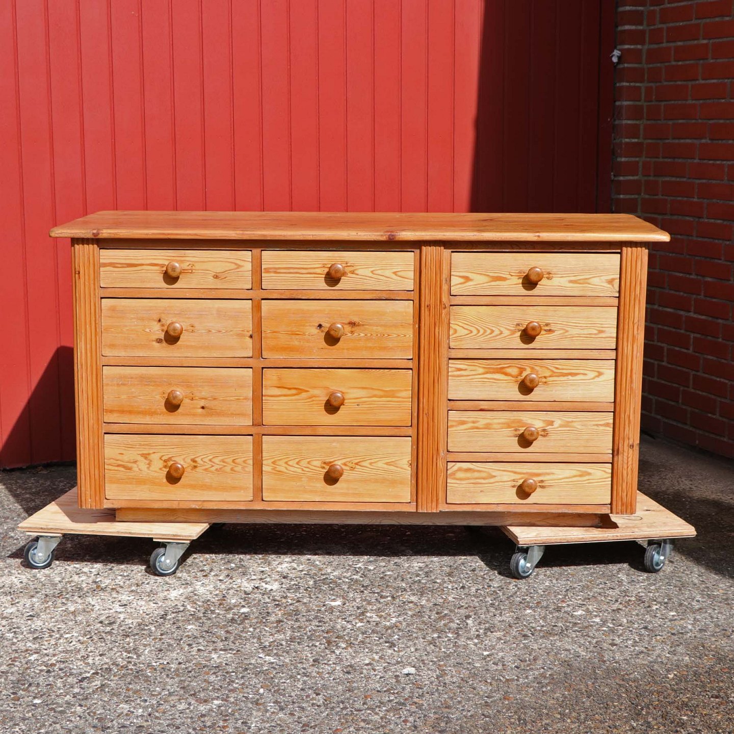 Købmandsdisk i solid fyrtræ med tretten skuffer i forskellige størrelser. Disken er lakeret med træknopper og rummer god mulighed for opbevaring.