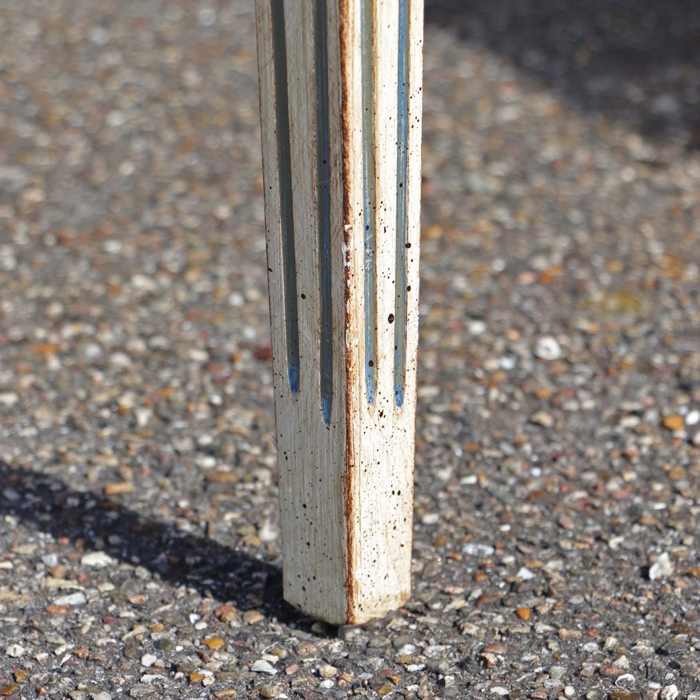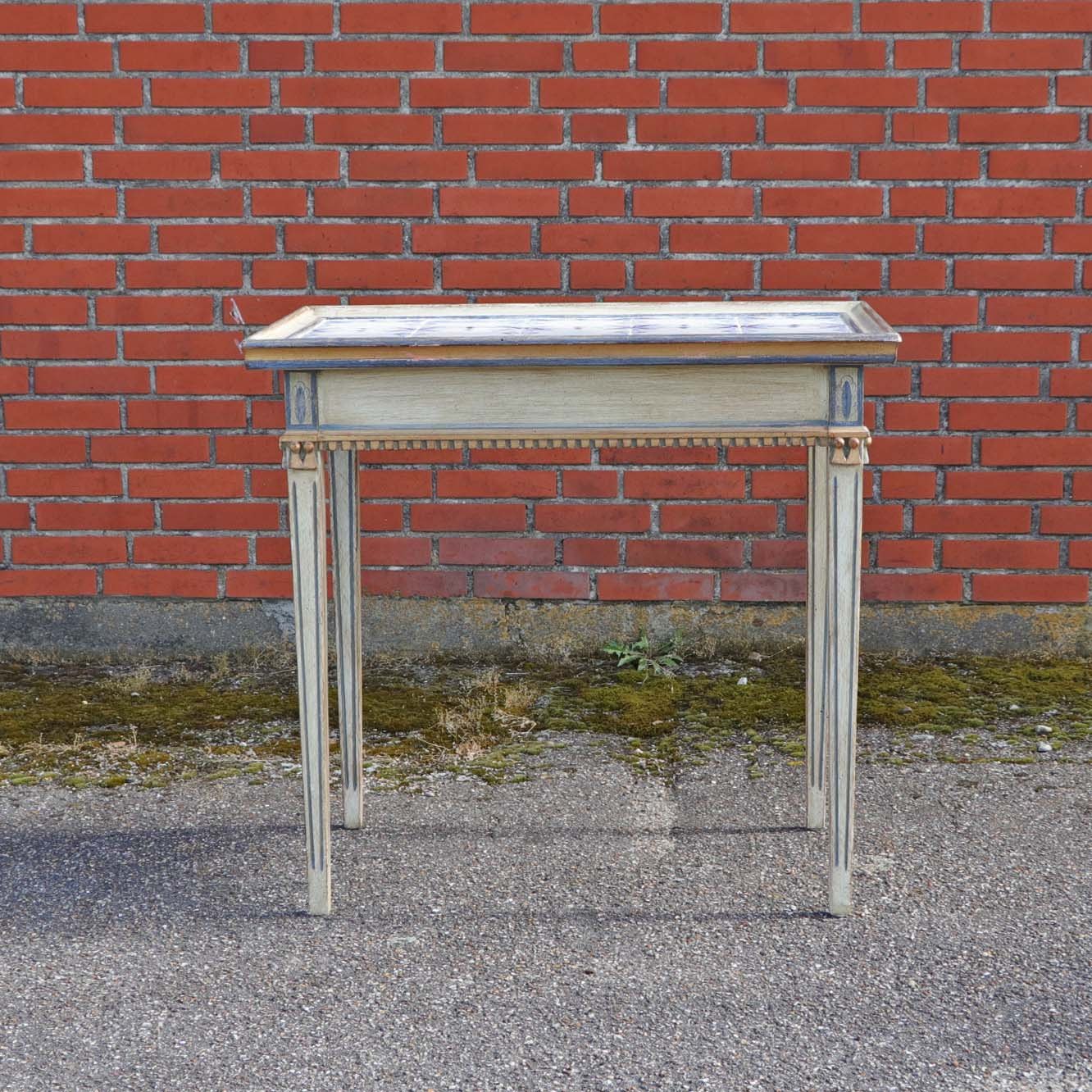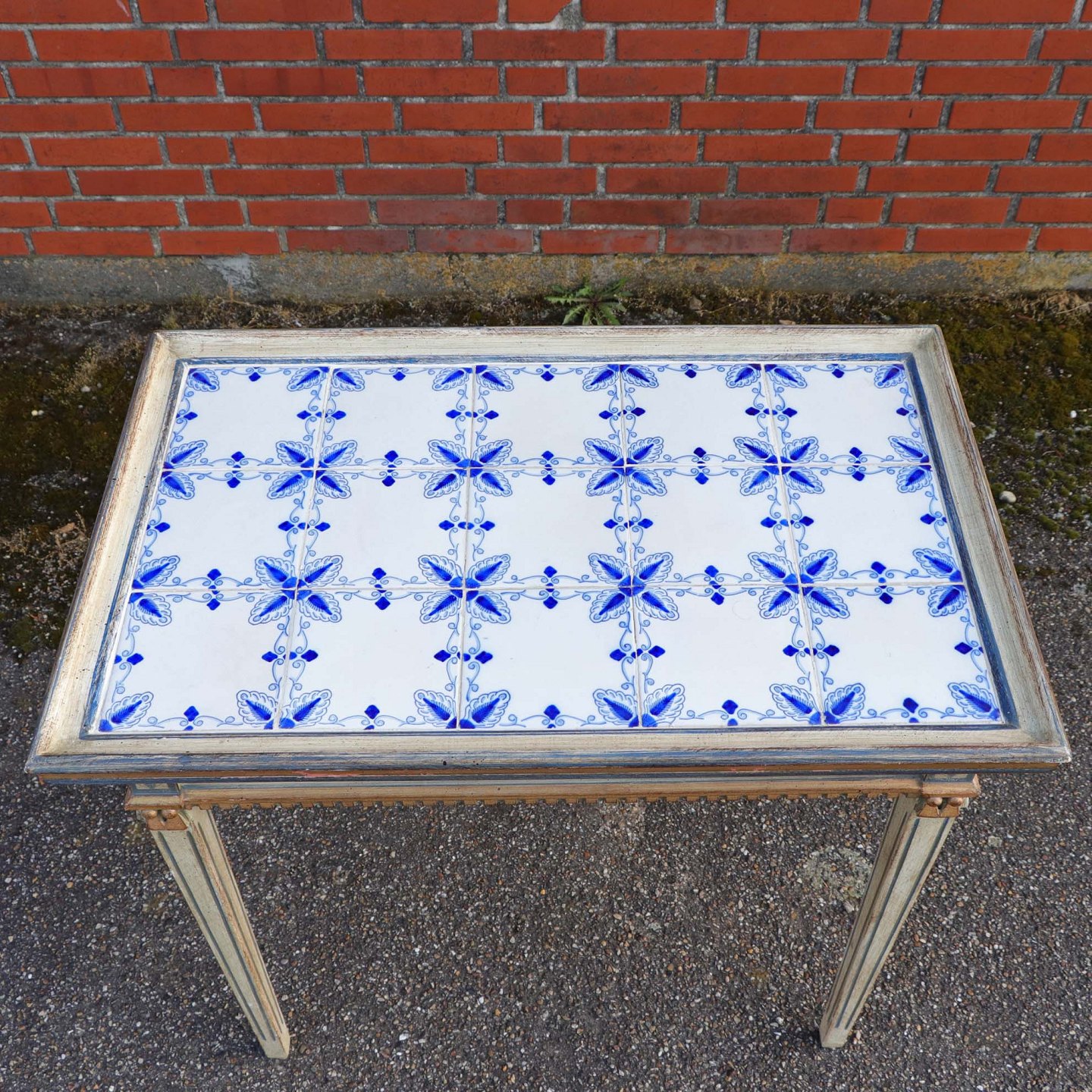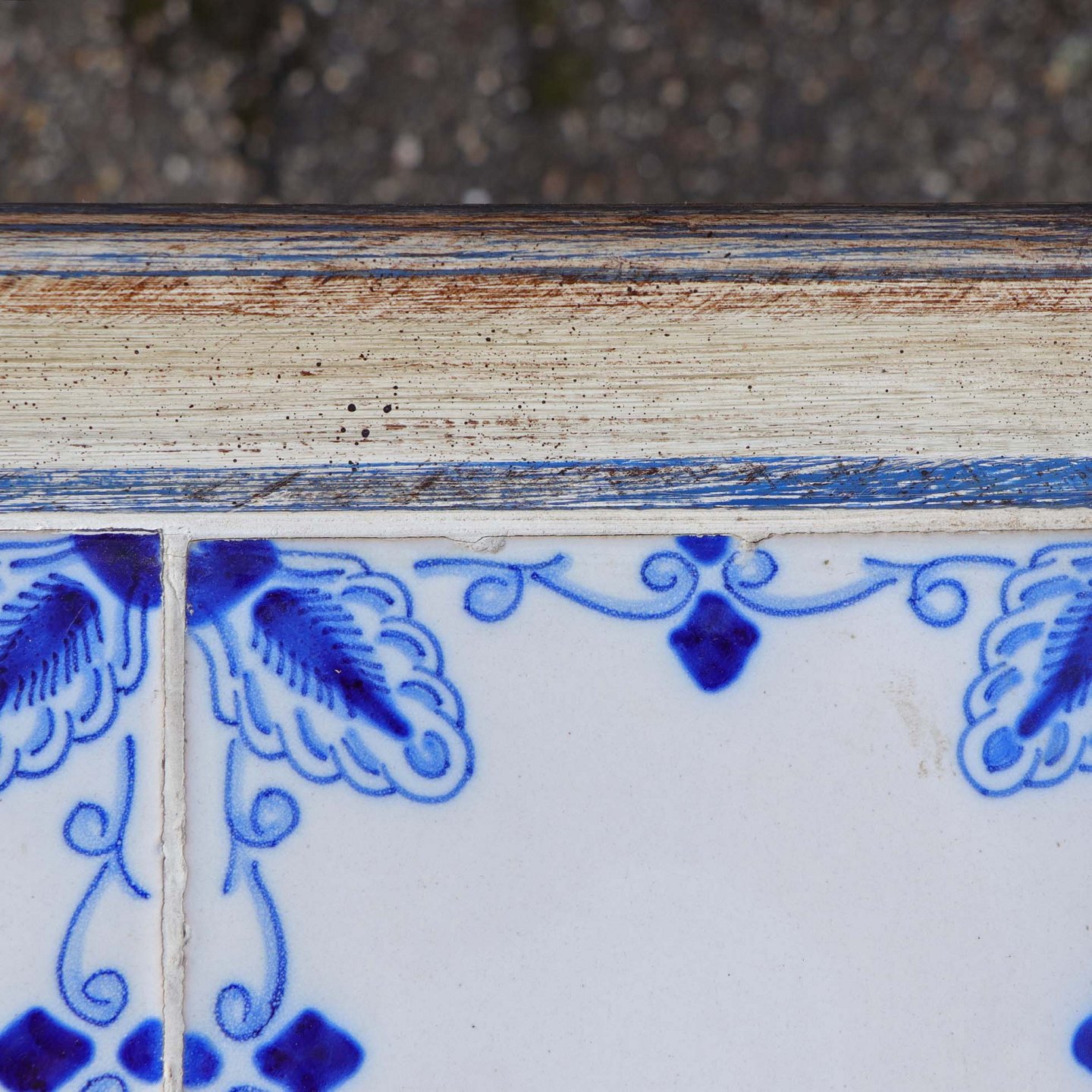 Ældre kakkelbord i blåt og hvidmalet træ med Hollandske kakler i hvidt porcelæn med blå mønster.