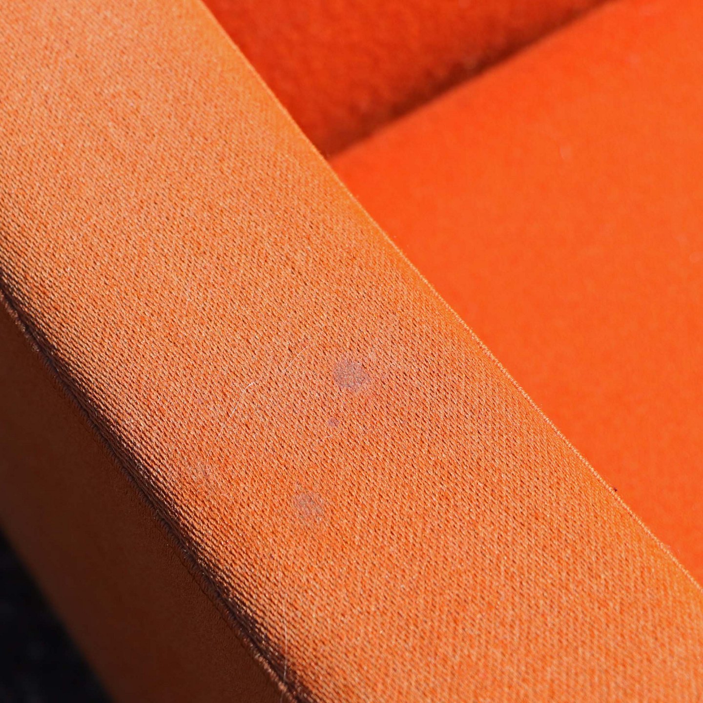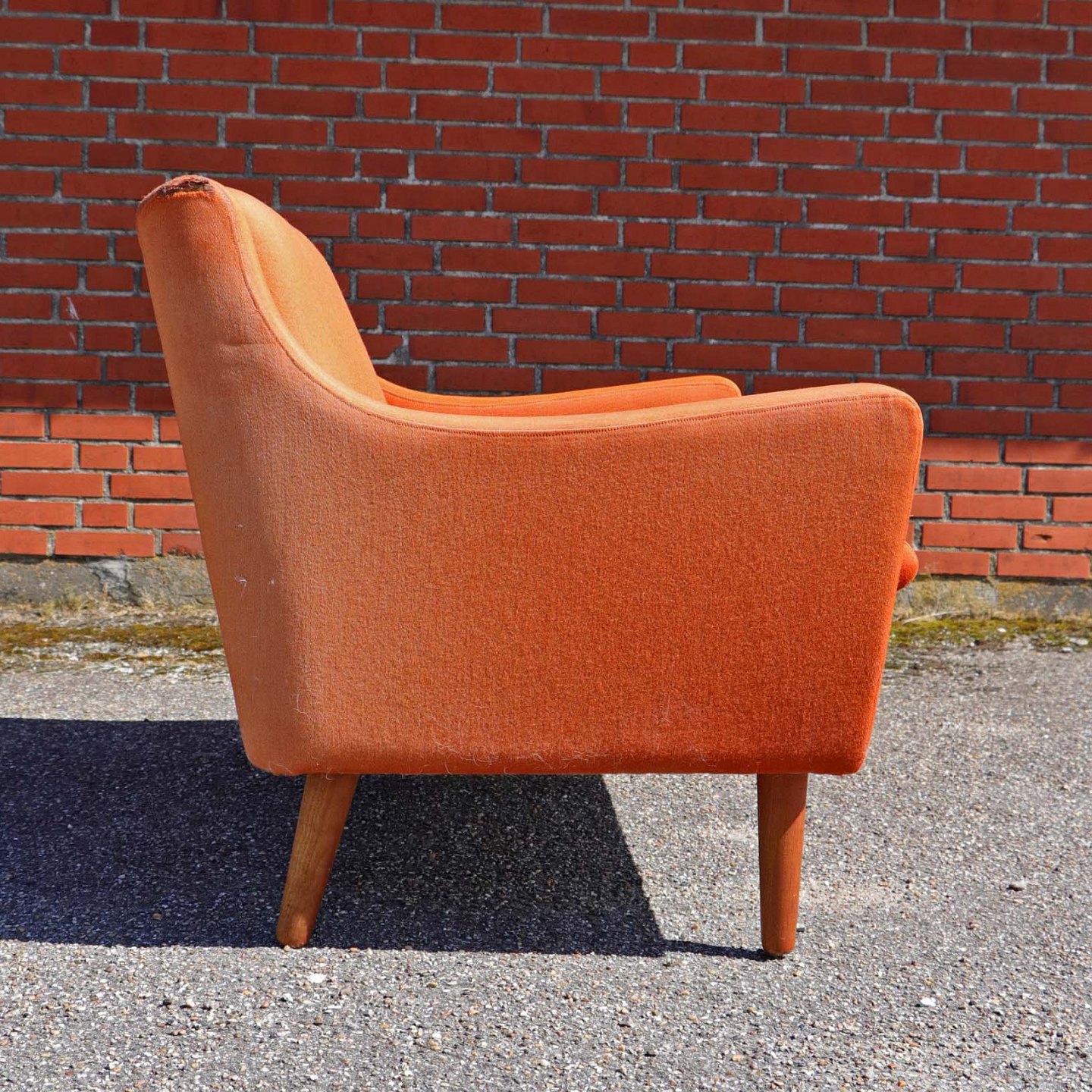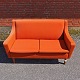 To personers sofa med solfalmet orange uldbetræk og stel i teaktræ. Sofaen trænger til ombetrækning.