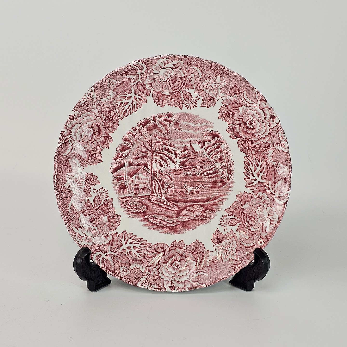 Rød Paris er af engelsk fajance dekoreret med forskellige landskaber og blomster i kanten, alt i forskellige røde nuancer