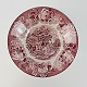 Rød Paris er af engelsk fajance dekoreret med forskellige landskaber og blomster i kanten, alt i forskellige røde nuancer