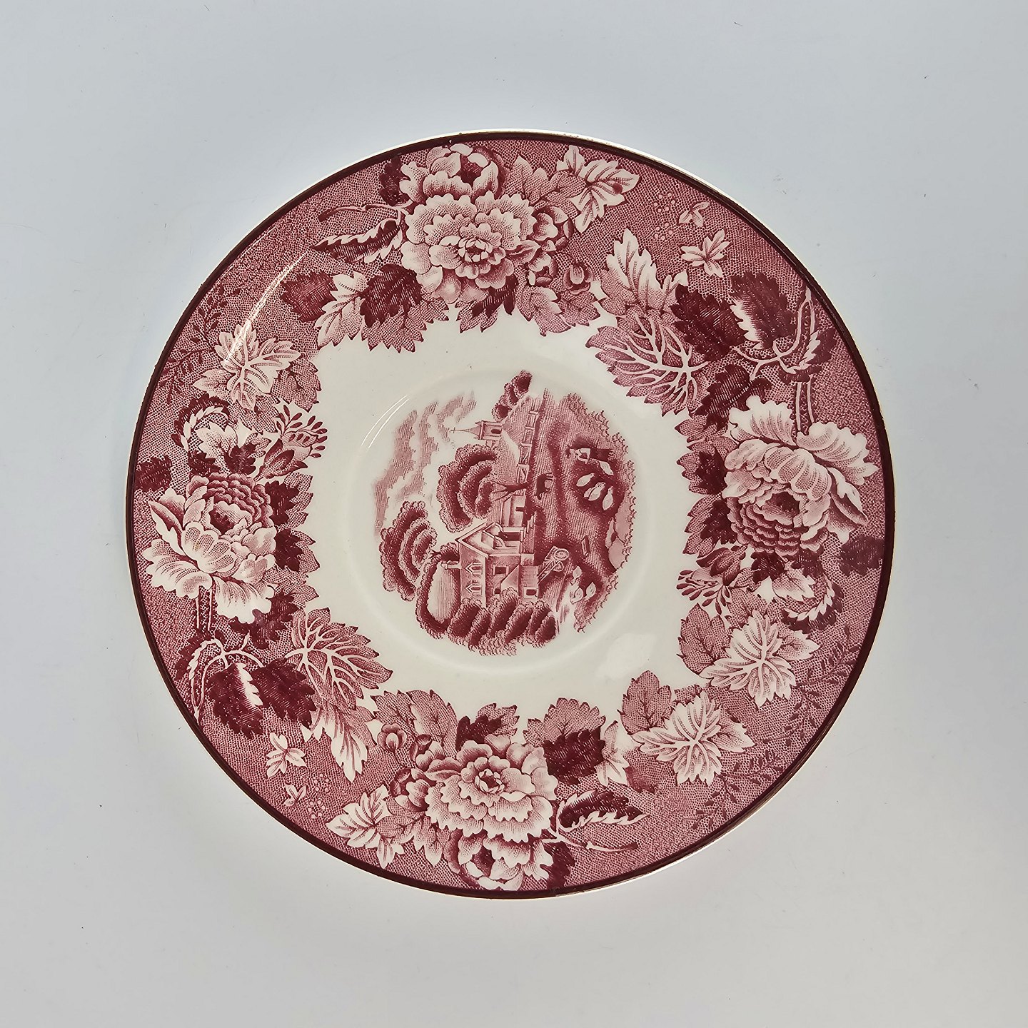 Rød Paris er af engelsk fajance dekoreret med forskellige landskaber og blomster i kanten, alt i forskellige røde nuancer