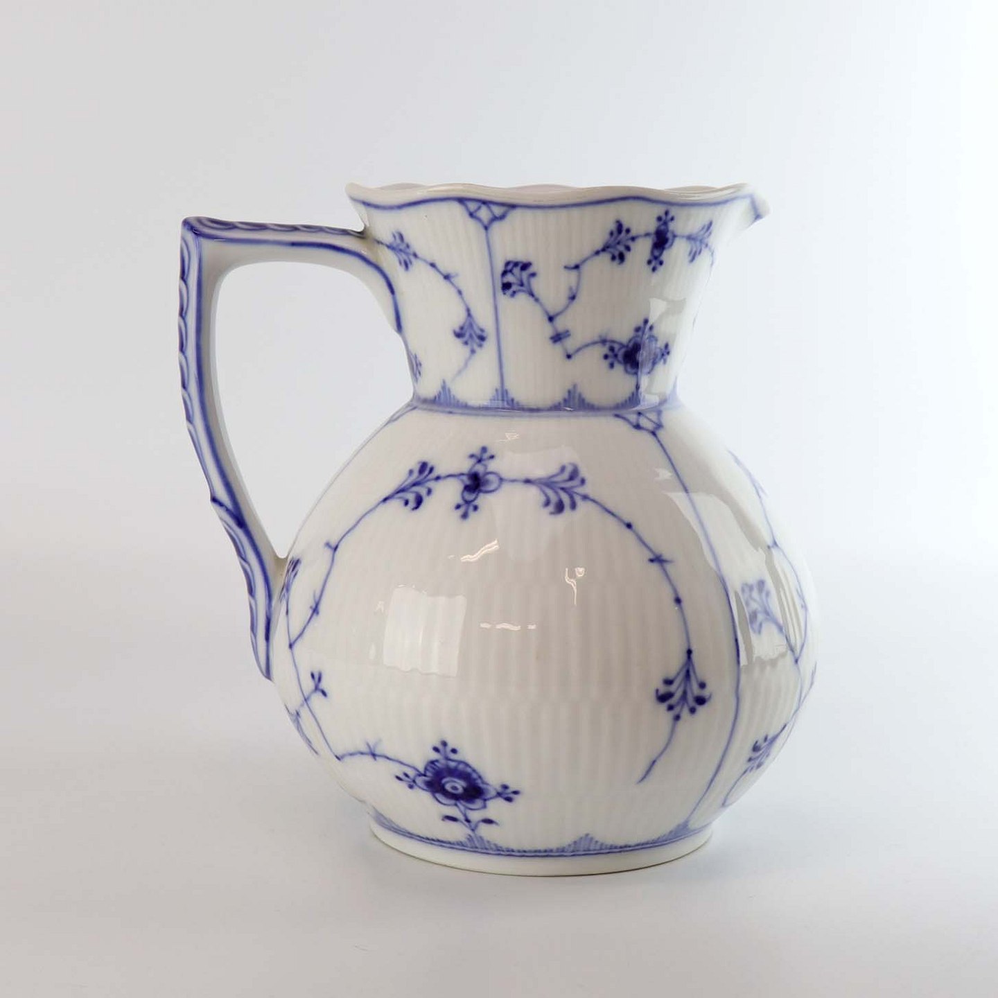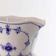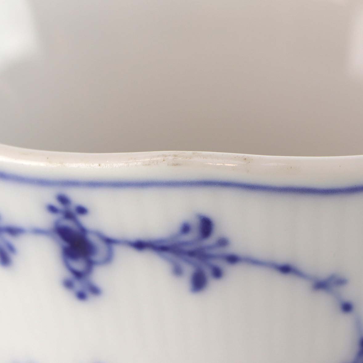 Musselmalet er af kongeligt hvidt porcelæn, dekoreret med rifler og mønster af blå ranker og blomster