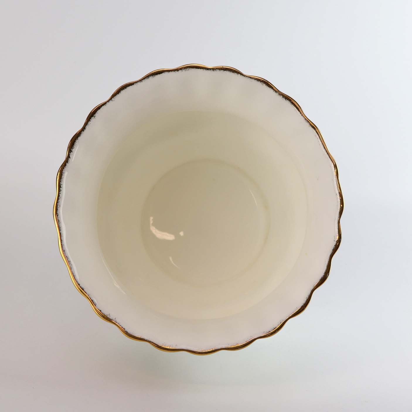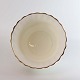 Service i glat hvidt porcelæn med motiv af farverige roser. Topkanten har en let bølget form belagt med gylden dekoration.