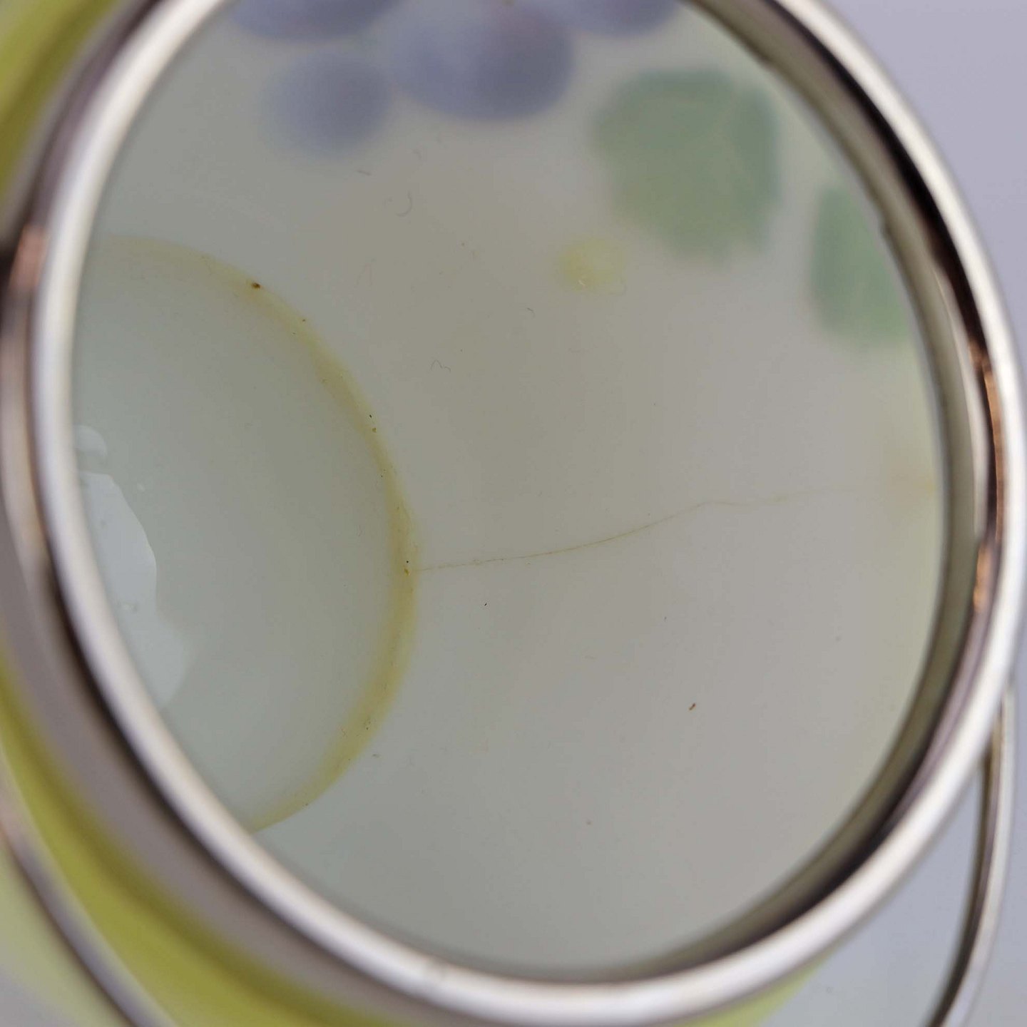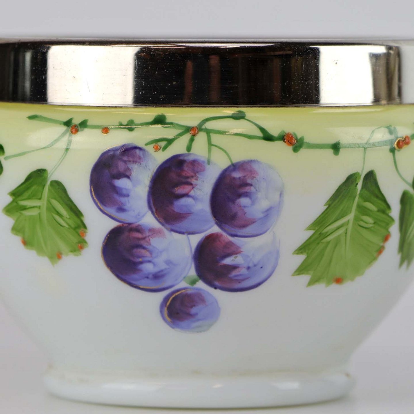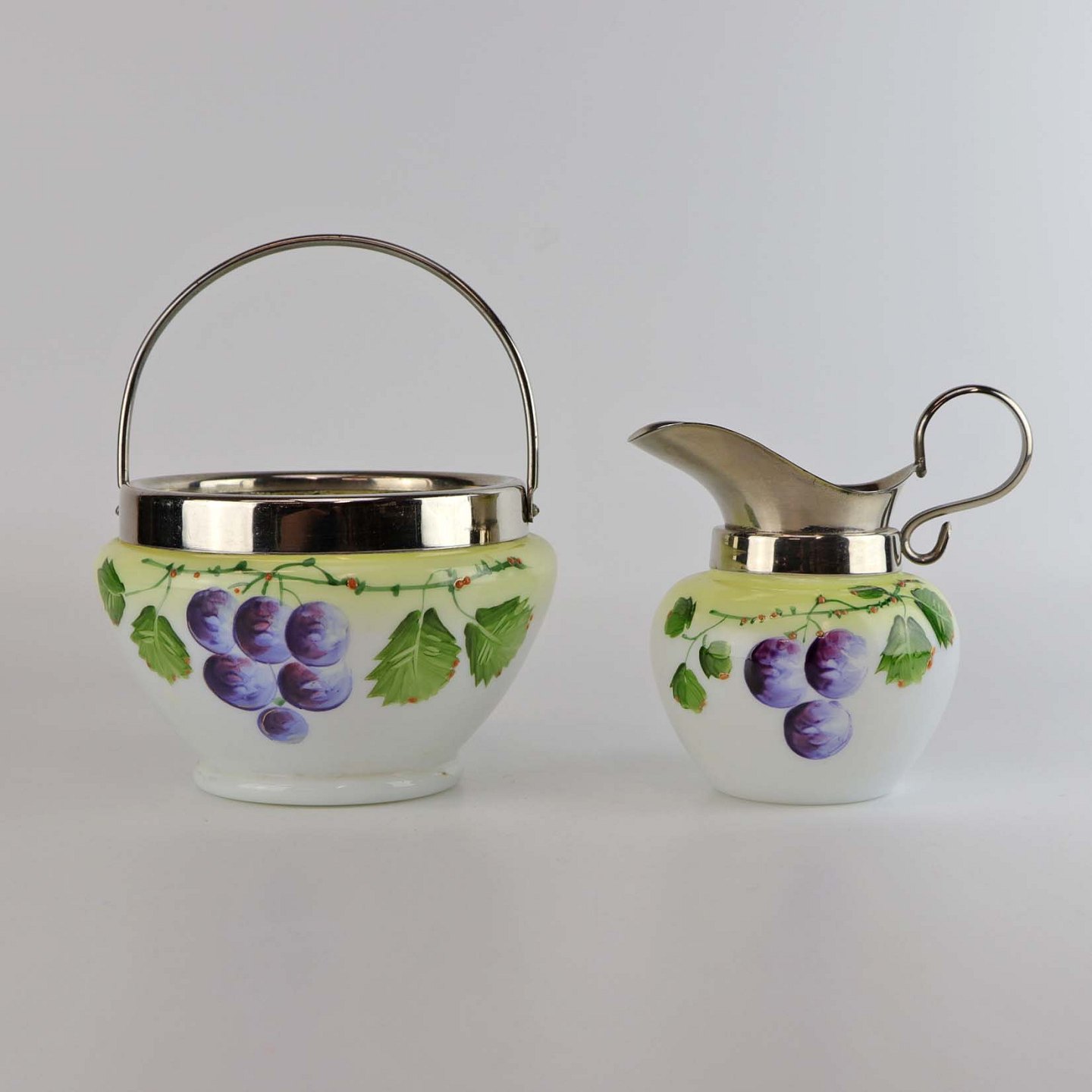 Sukkerskål og flødekande i malet opalineglas med malet motiv af mørklilla vindruesklase. Sættet har monteret hanke af pletsølv.