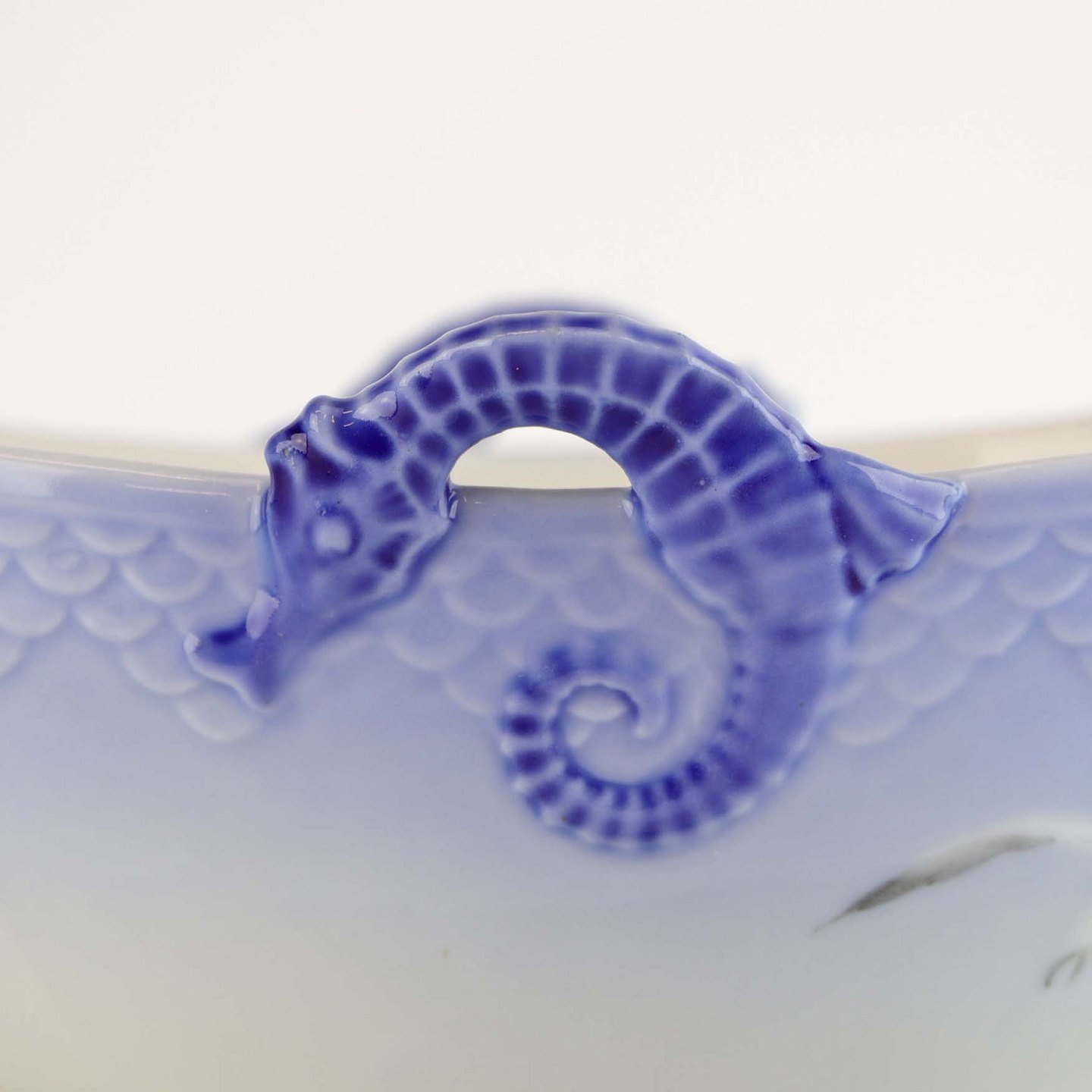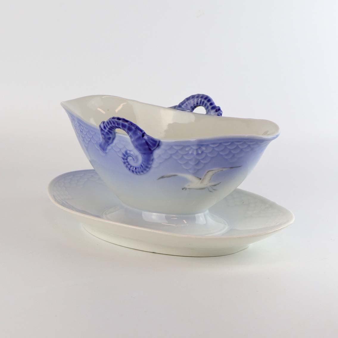 Service i glat porcelæn med skælform i blålige farver og motiv af måger