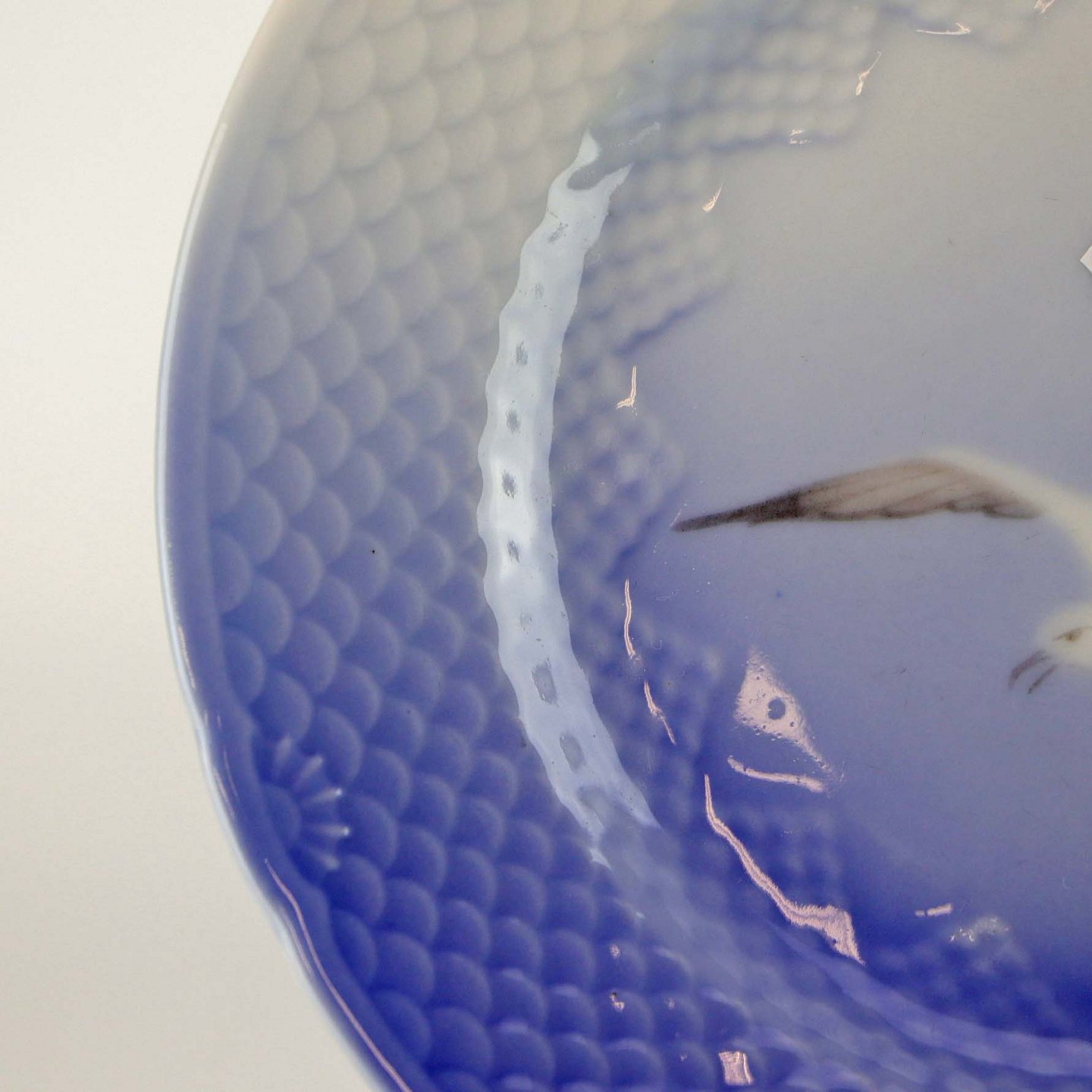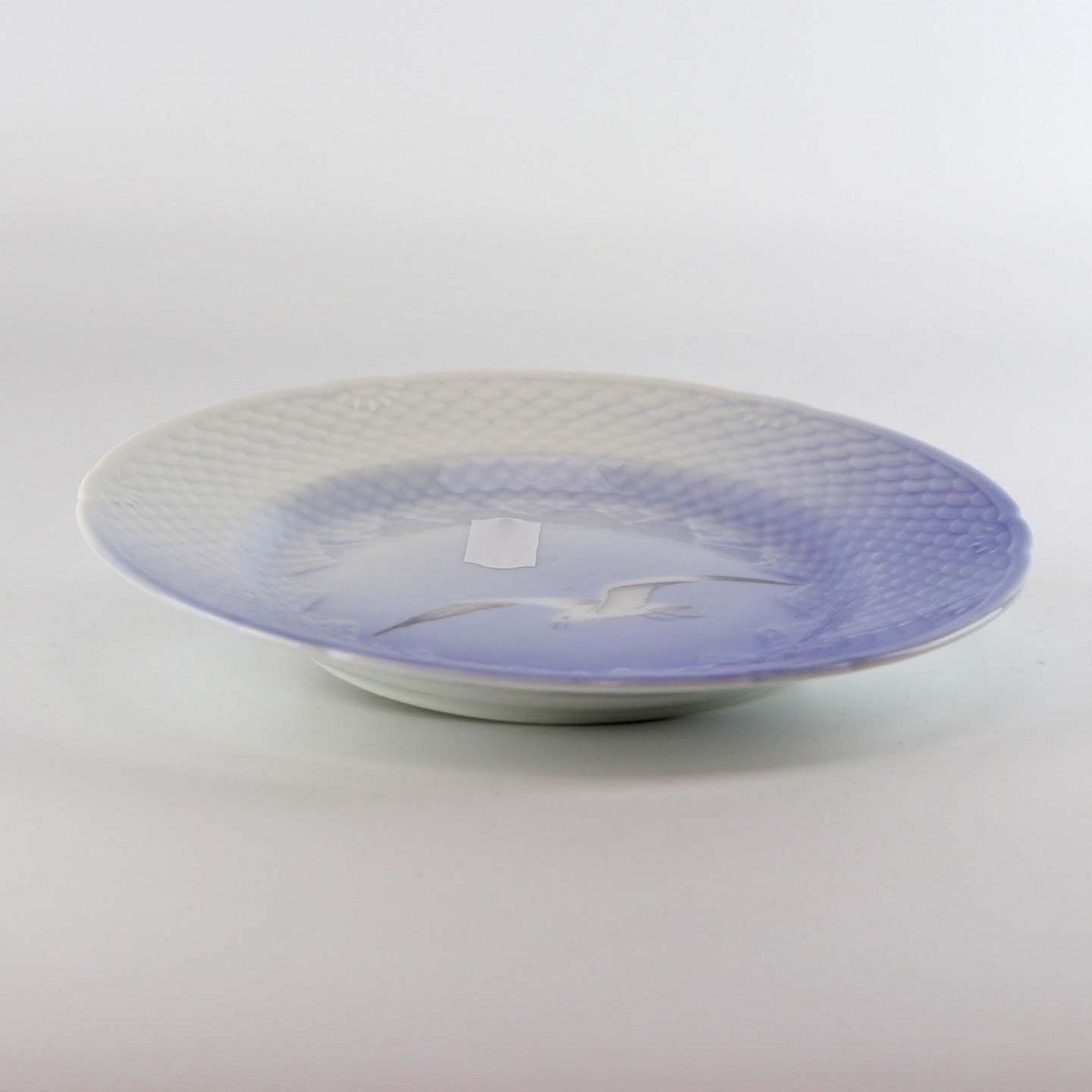 Service i glat porcelæn med skælform i blålige farver og motiv af måger