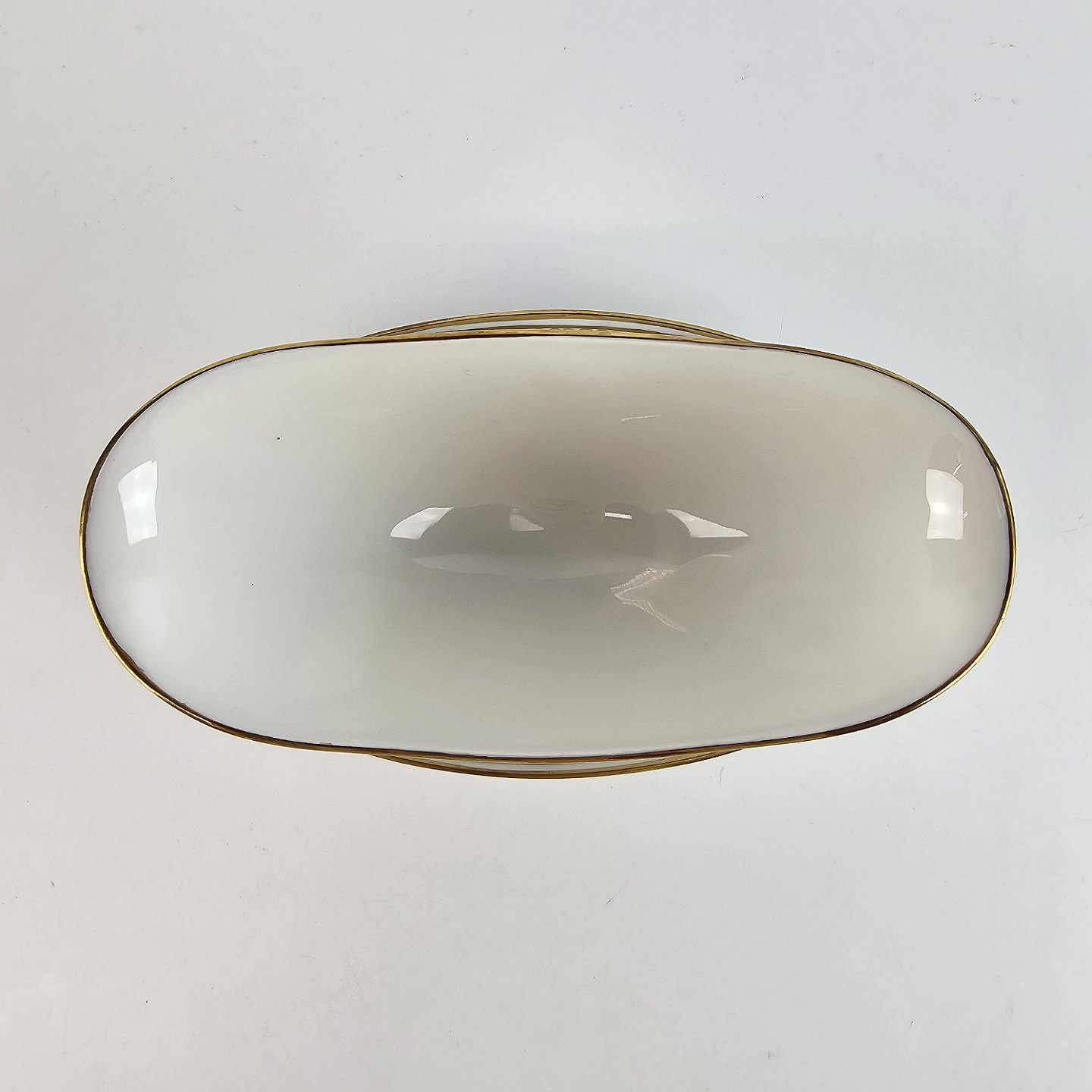 Menuet er hvidt glaseret porcelæn dekoreret med guld i kanten. Lettere brugsspor kan forekomme.