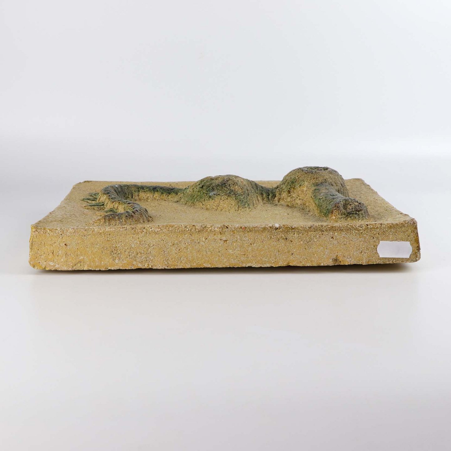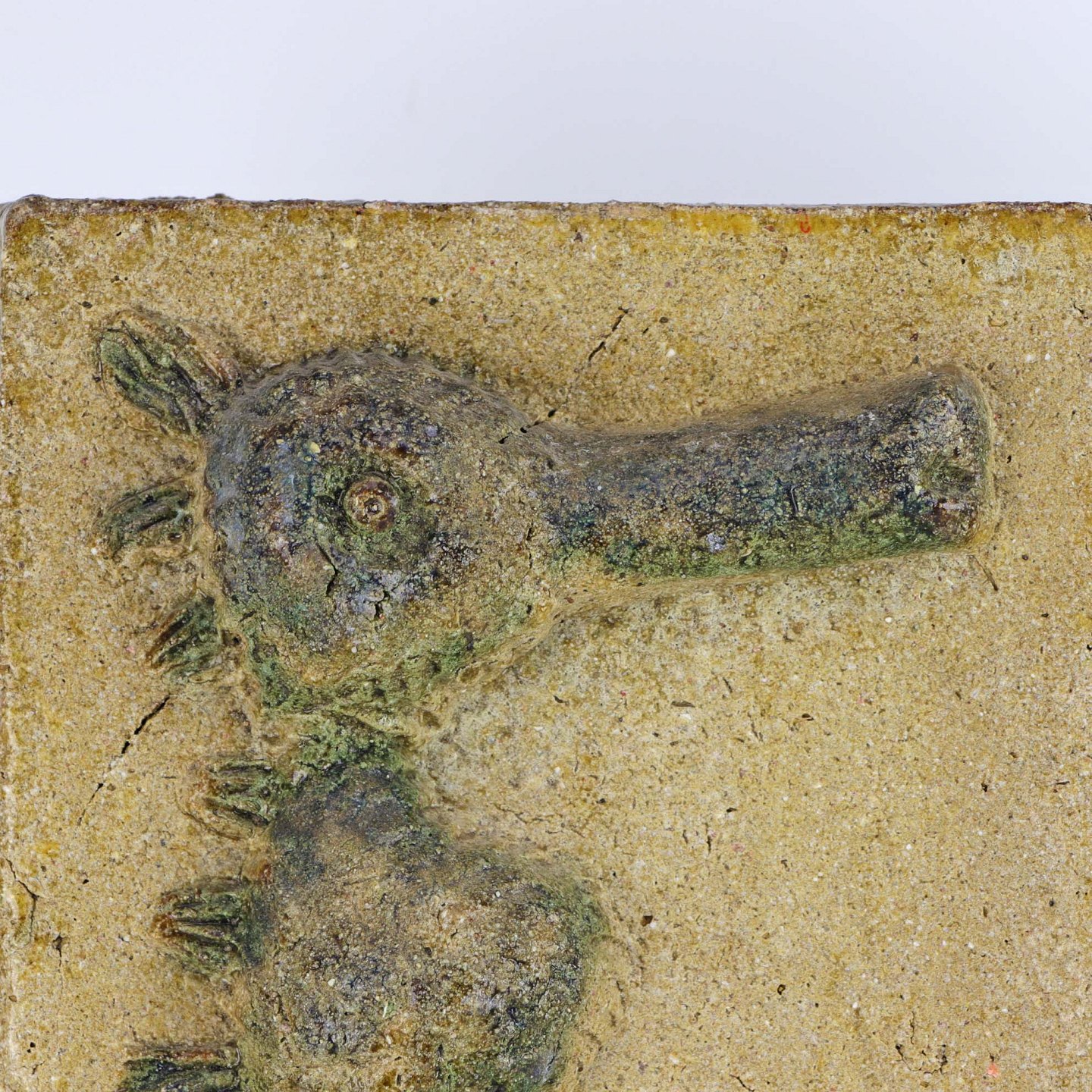 Relief i keramik med motiv af en grønlig søhest på gullig bagrund