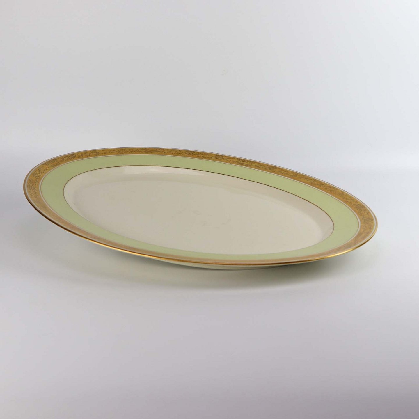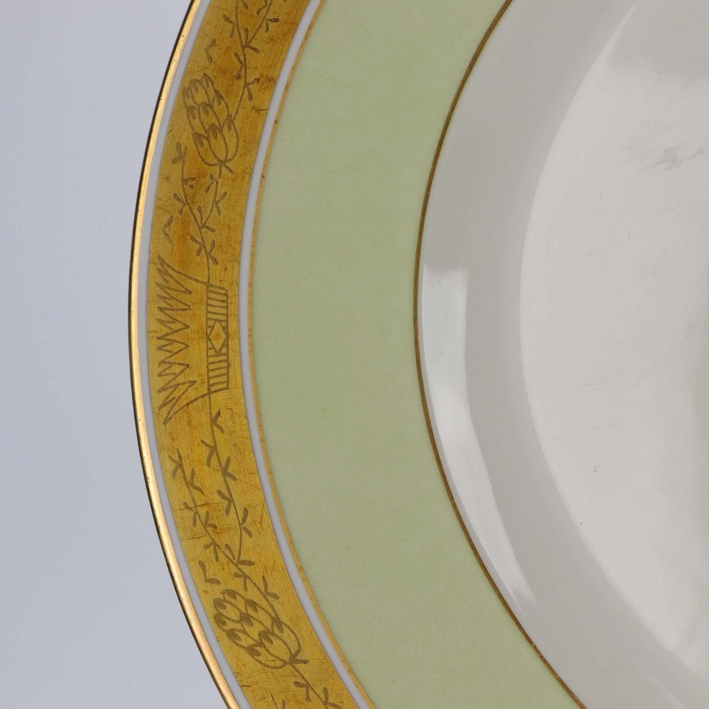 Fad i lys grøn og hvid porcelæn med gylden bort med motiv af krone og plantemotiver.