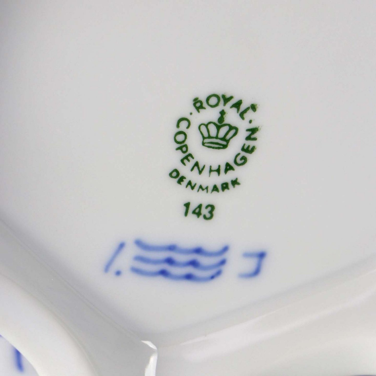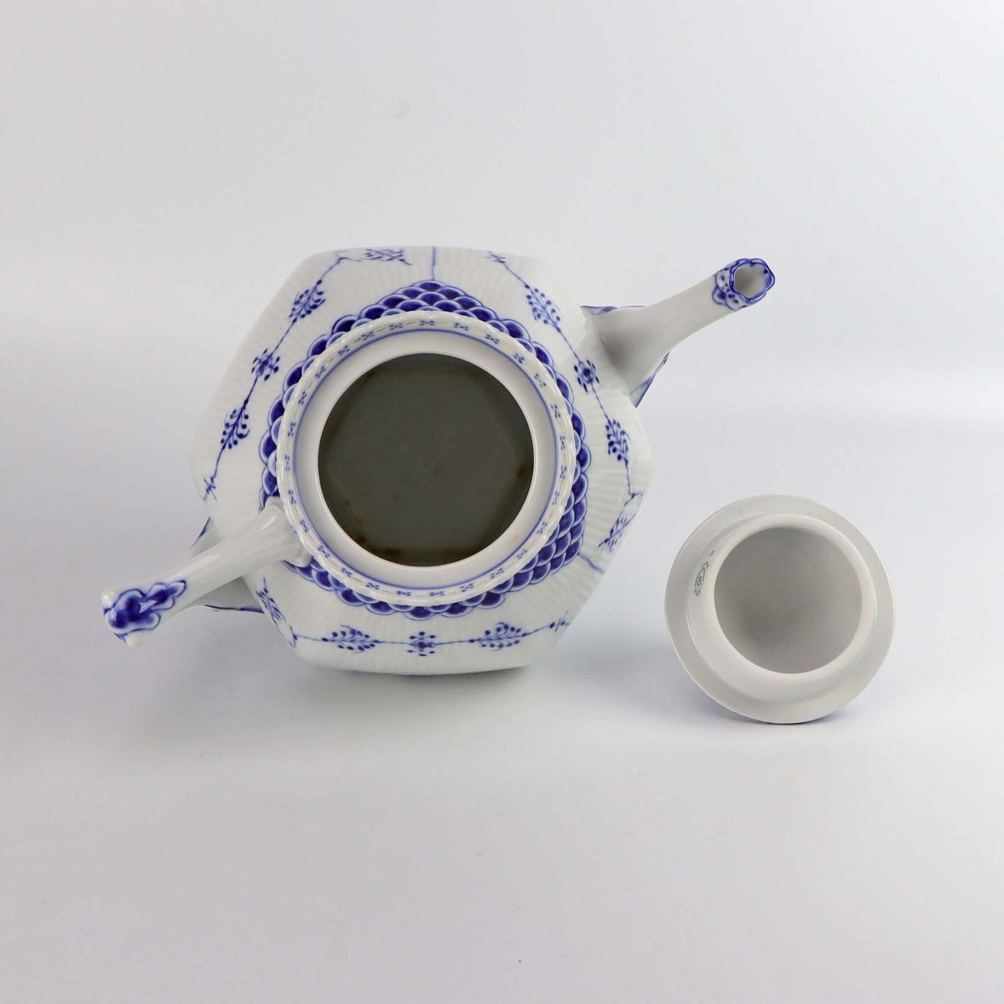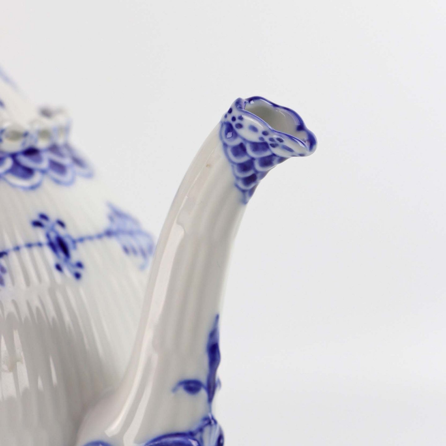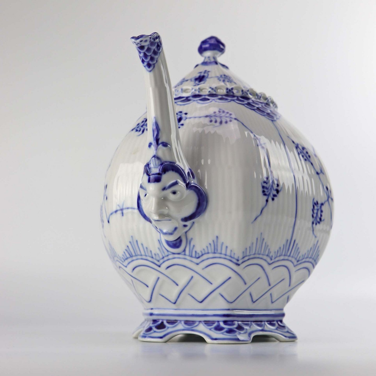 Kongelig tekande i porcelæn fra stellet Musselmalet Helblonde nr. 143 og 142. Kanden kan indeholde 1 liter og er fremstillet i år 2004 i Danmark