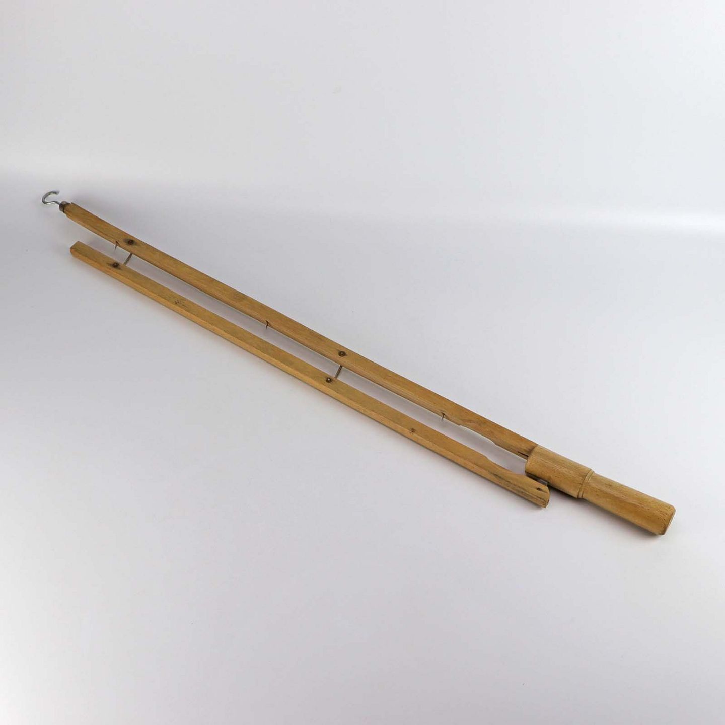 Gammel avisholder i lyst træ med håndtag og krog til ophæng på væggen