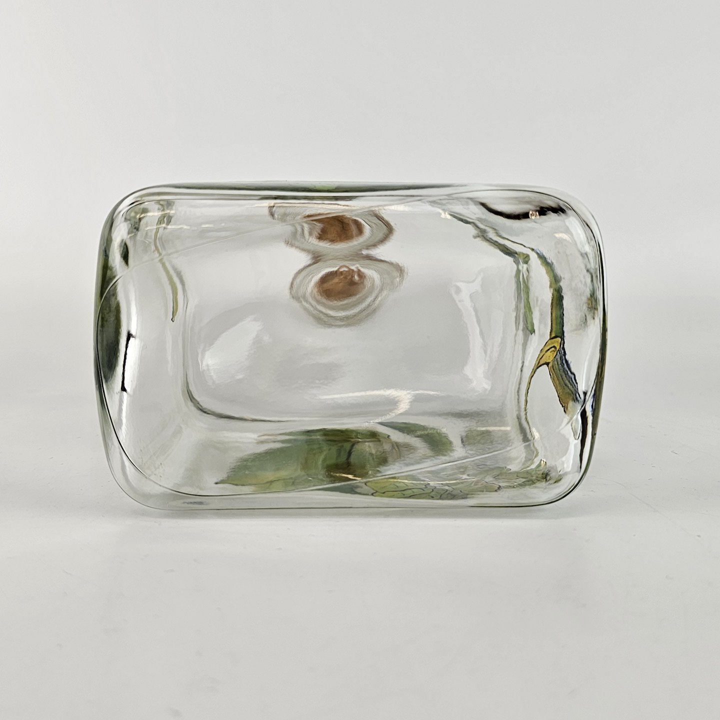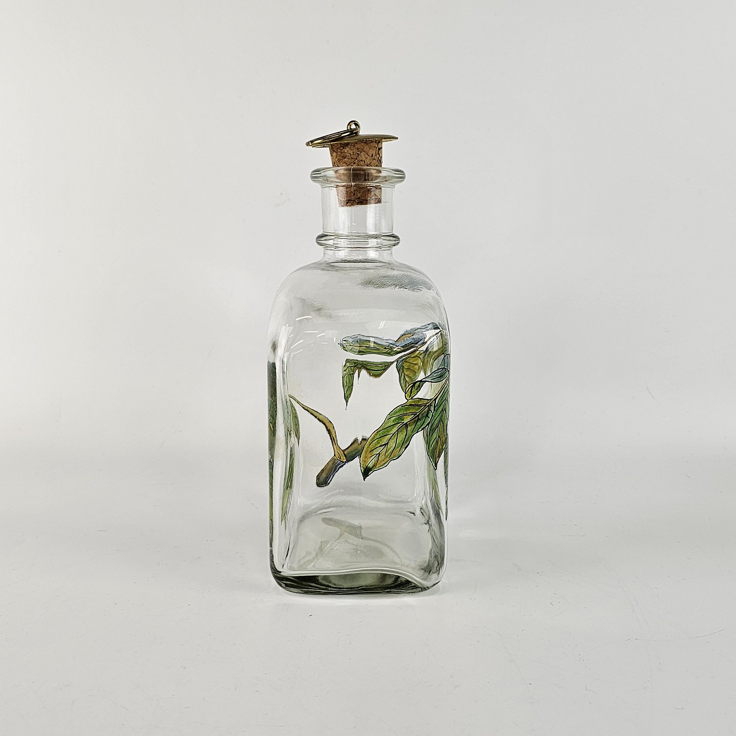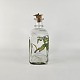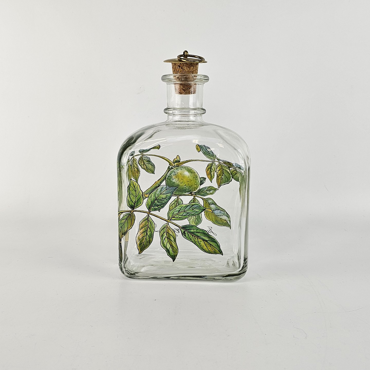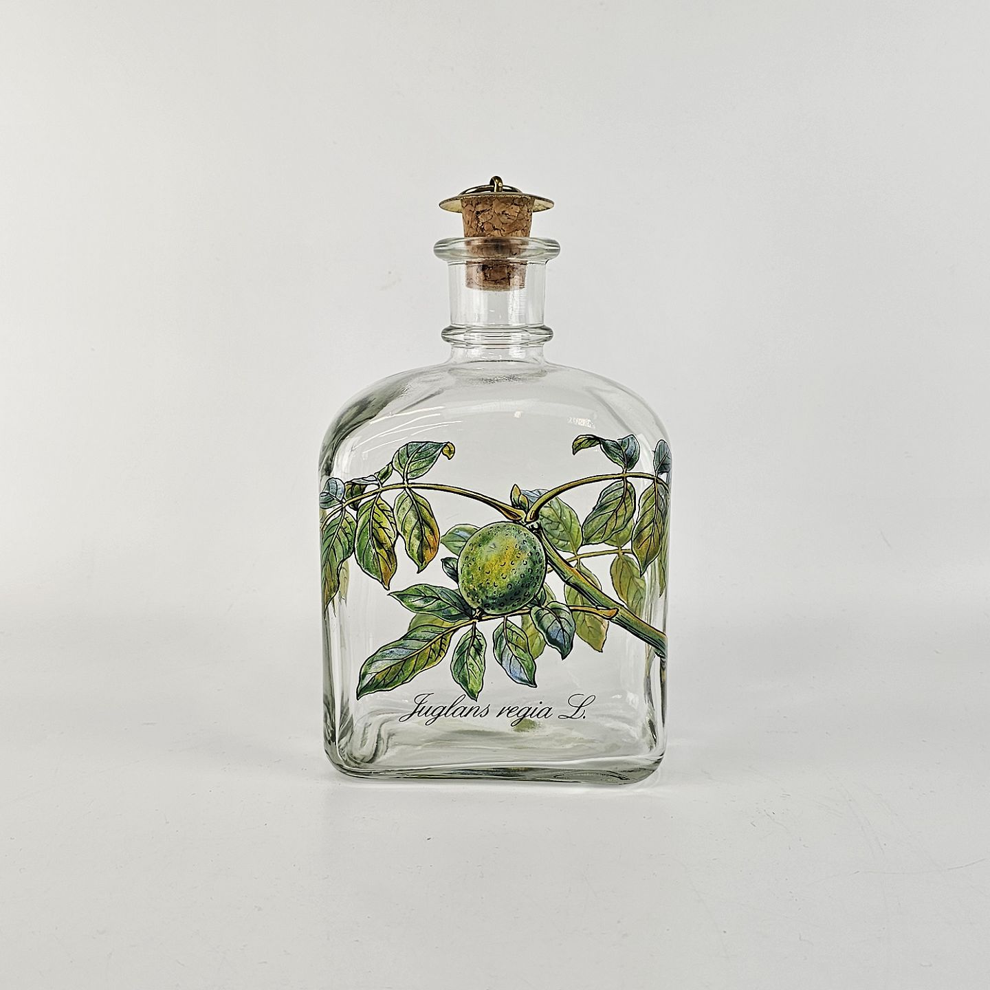 Firkantet glaskaraffel med buet top og tilhørende korkprop. Dekoreret med valnøddegren, der slynger sig om karaflen og teksten Juglans regia L.