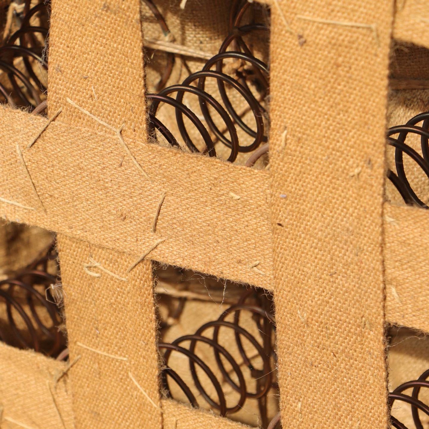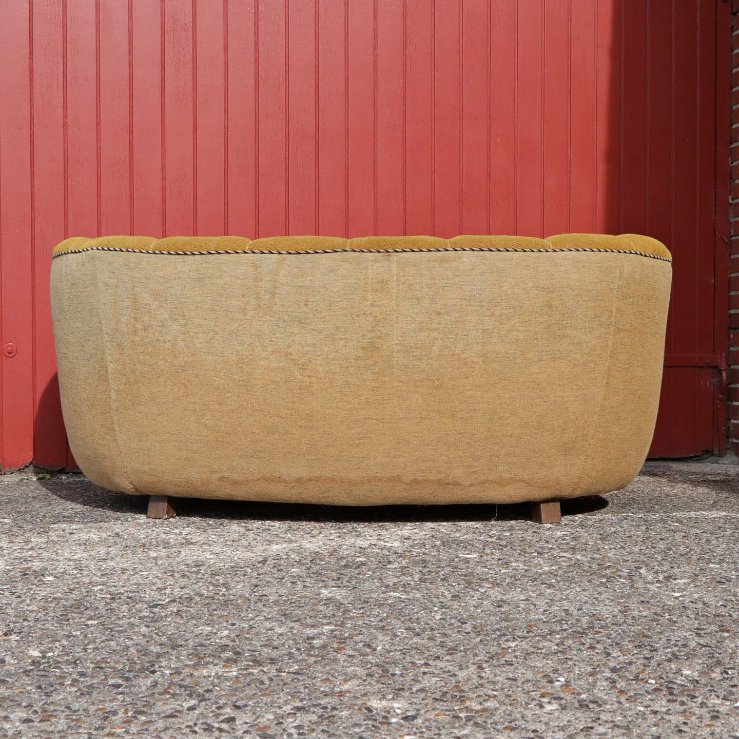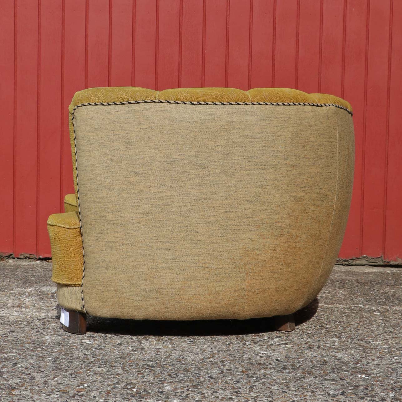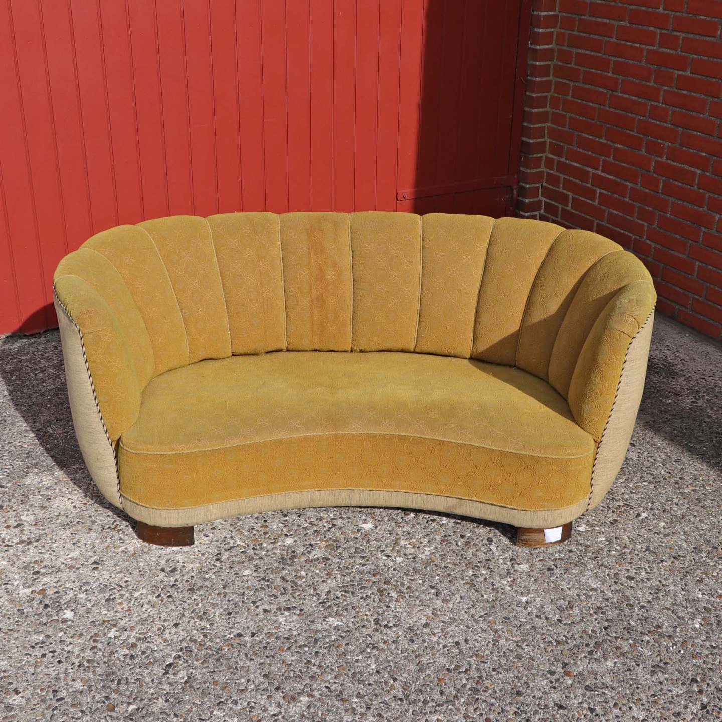 Ældre to personers sofa med form som en banan. Sofaen har sæde af springfjeder og er betrukket med slidtstærkt grøngul mønstret stof og mørk lakeret træben.