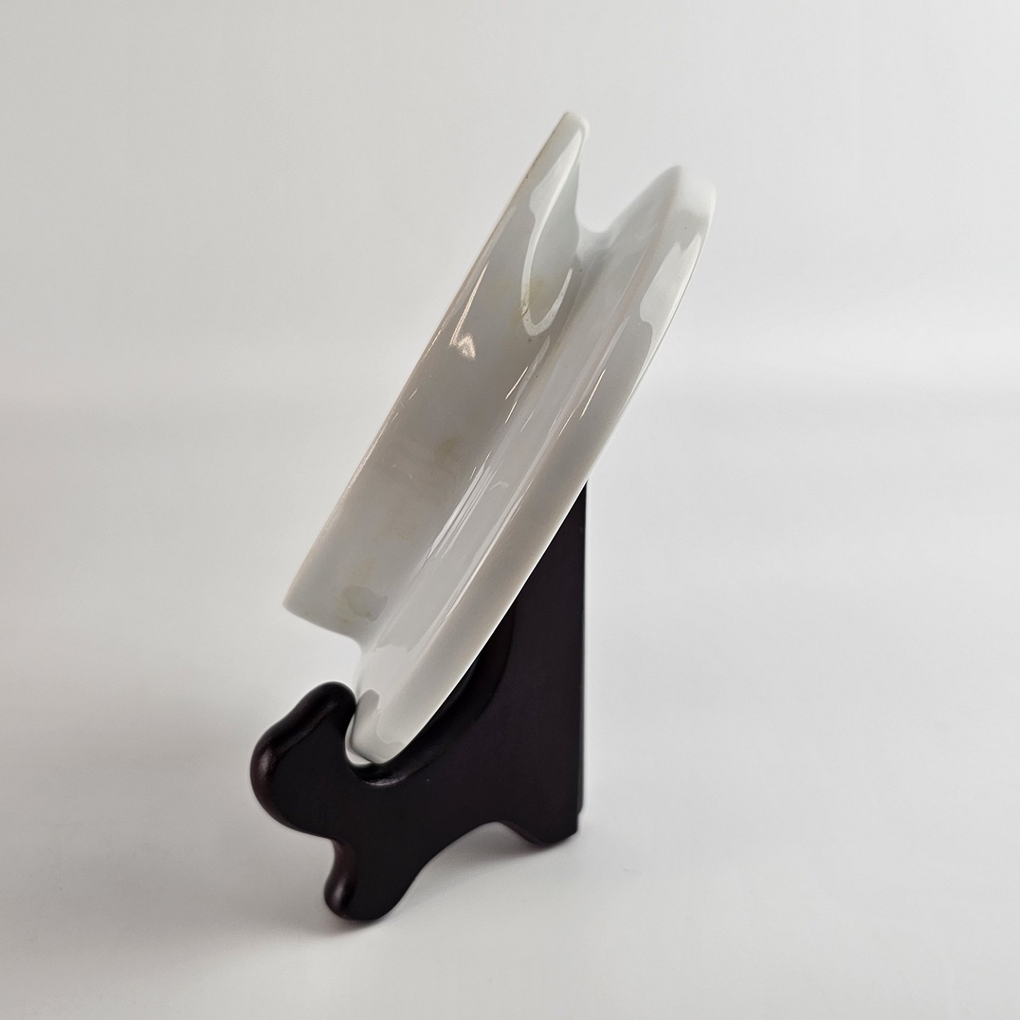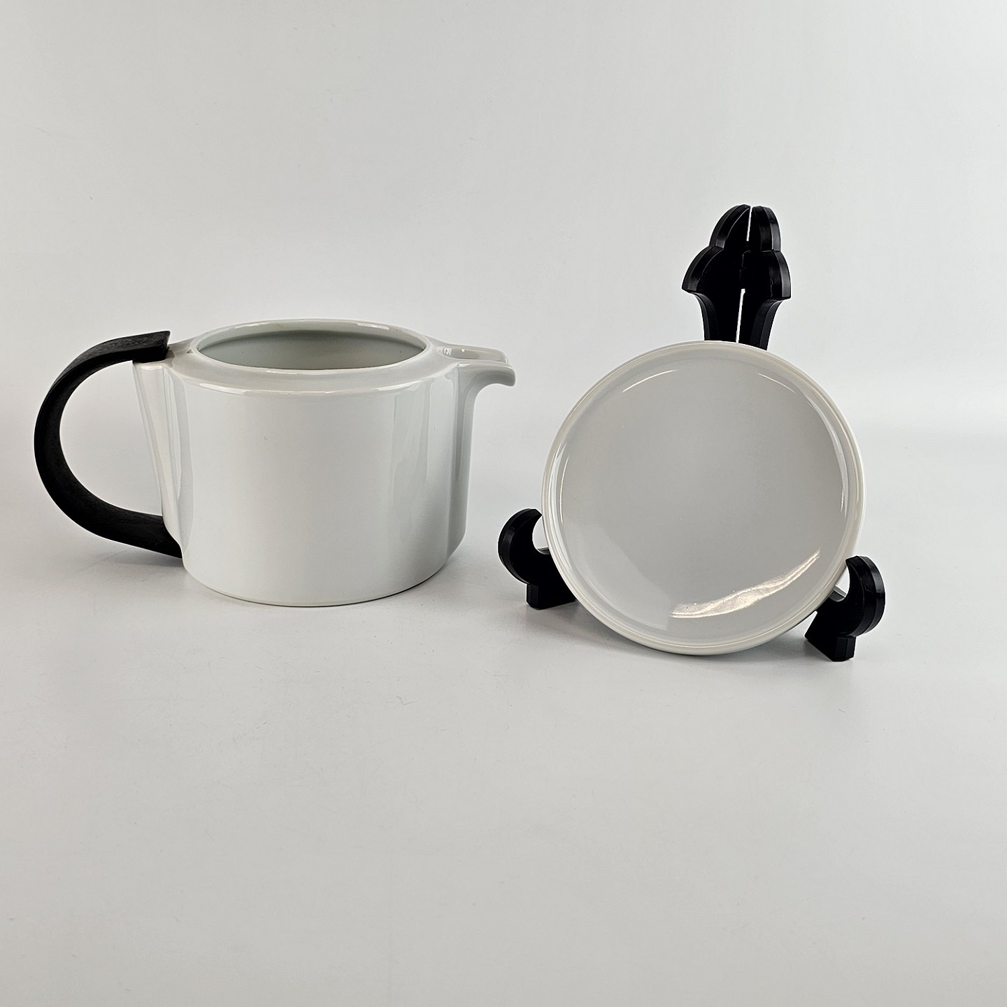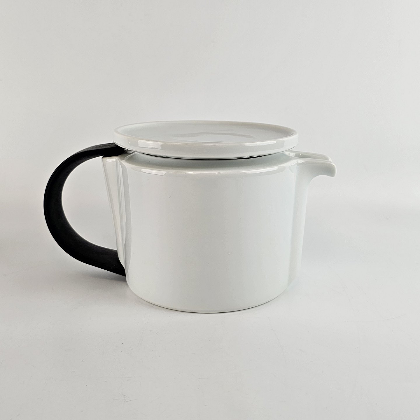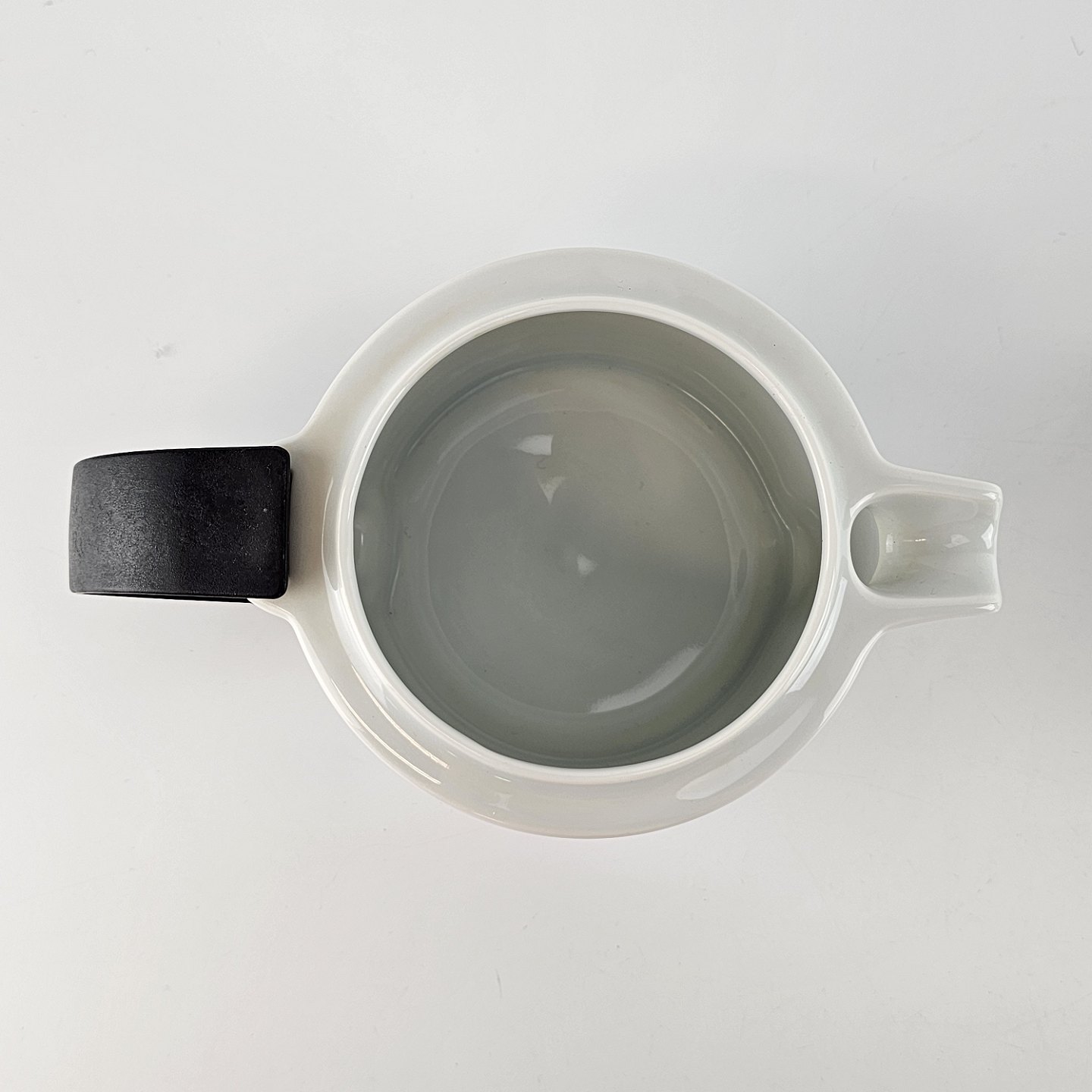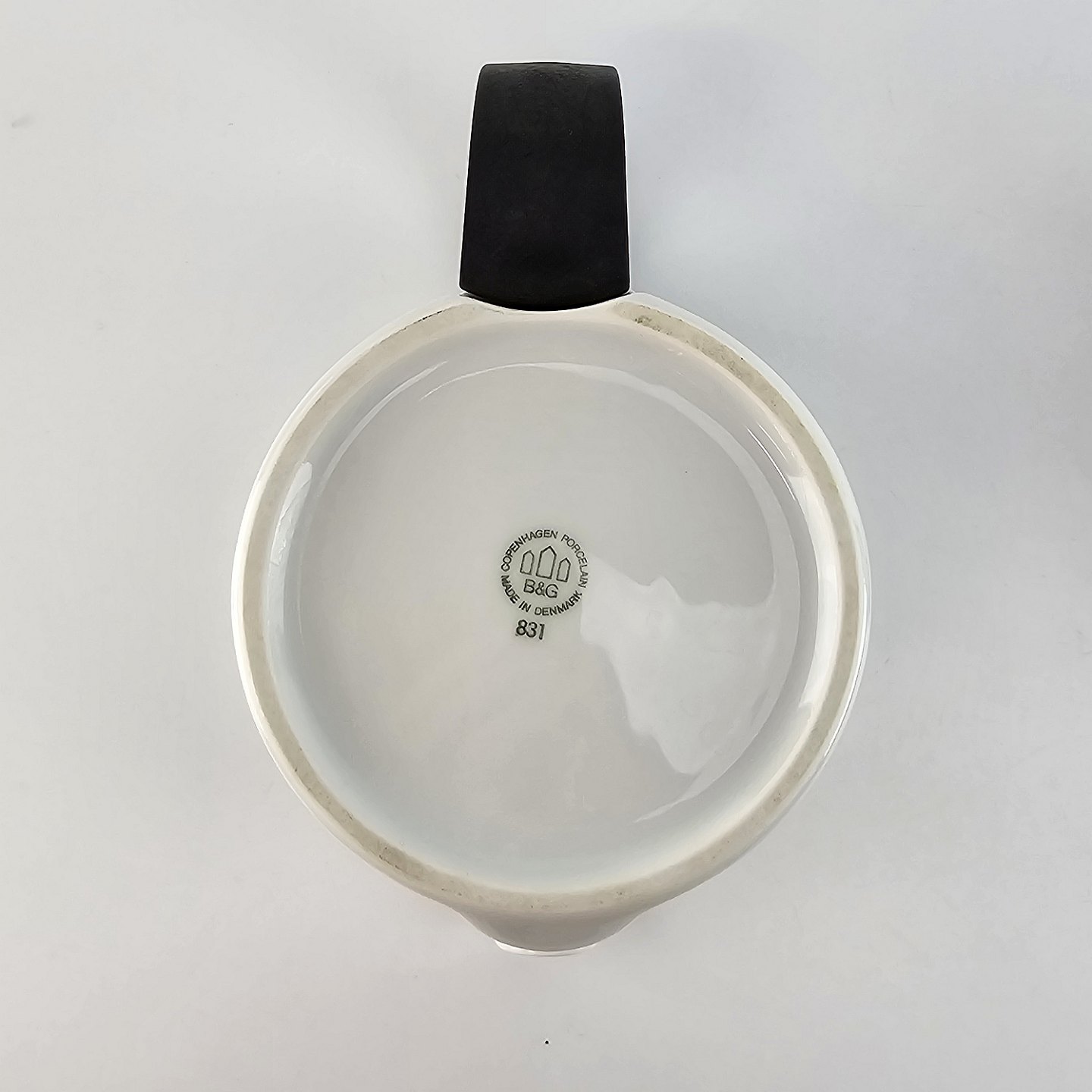 Hank er af hvidt glaseret porcelæn og med sorte hanke. Brugsspor kan forekomme