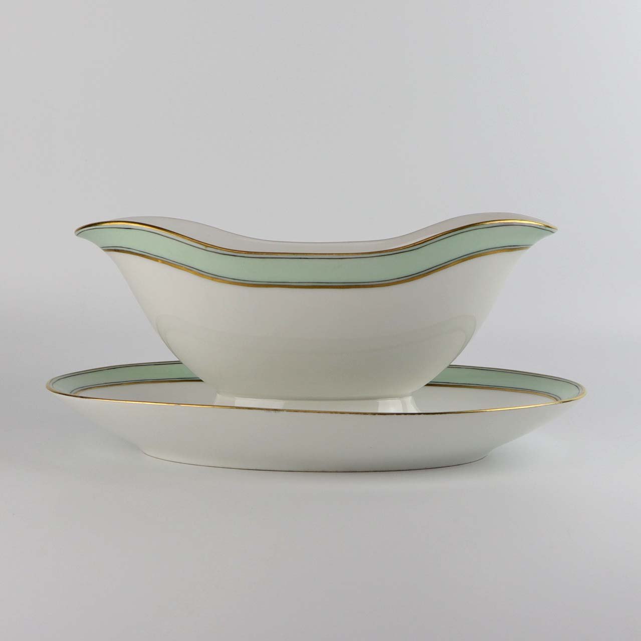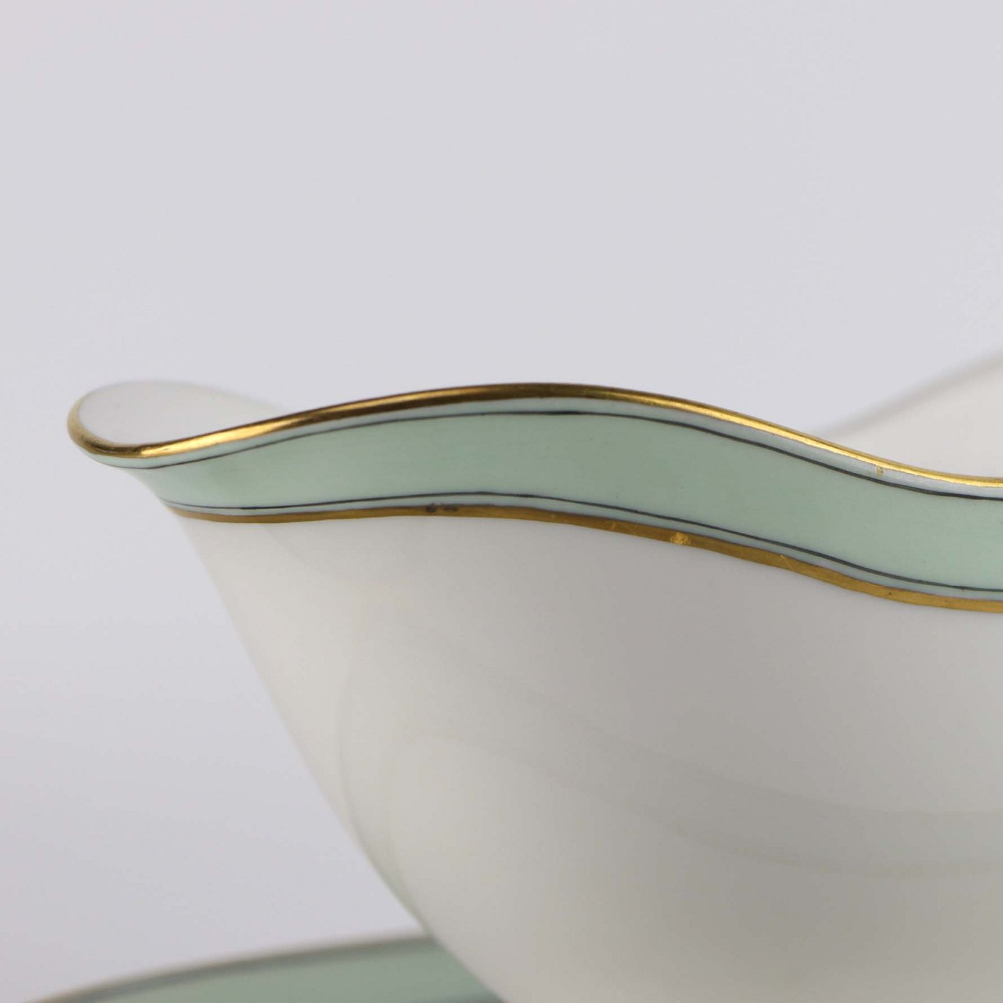 Service i glat hvidt porcelæn med mintblå dekoration og dobbelte guldkanter