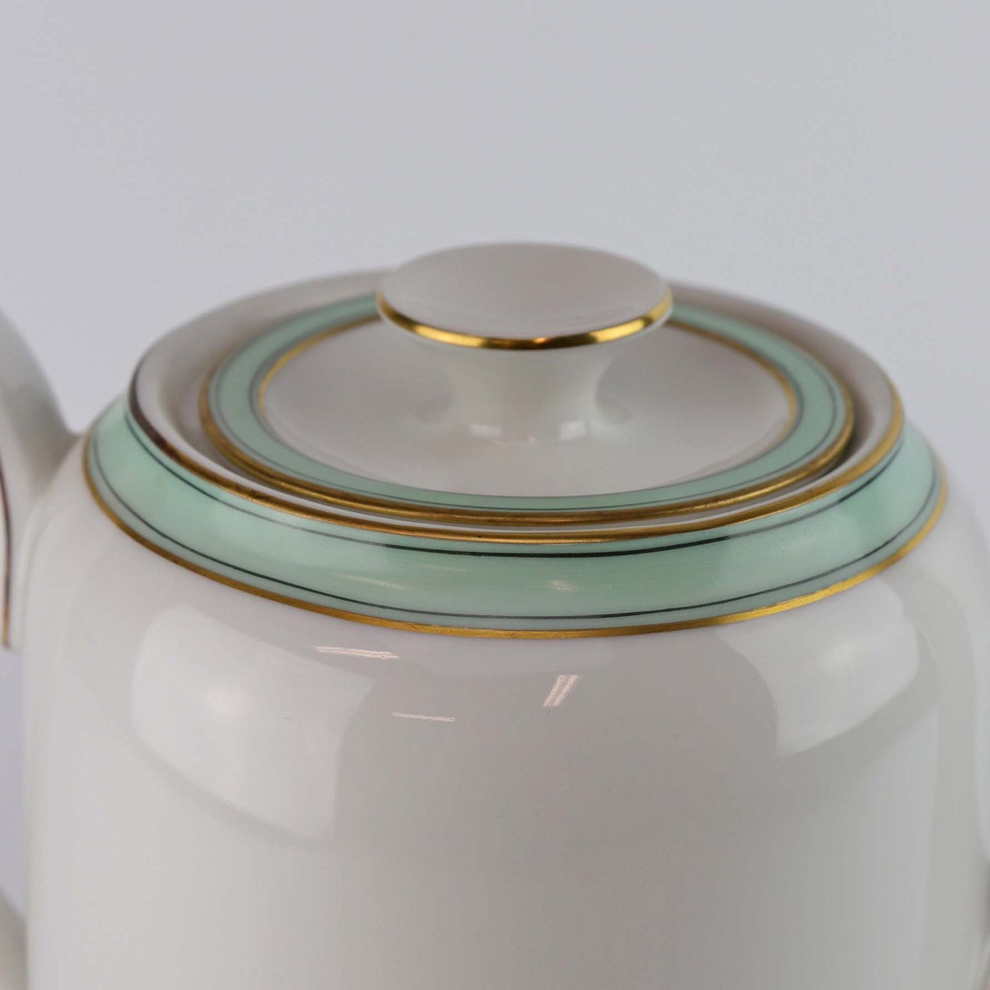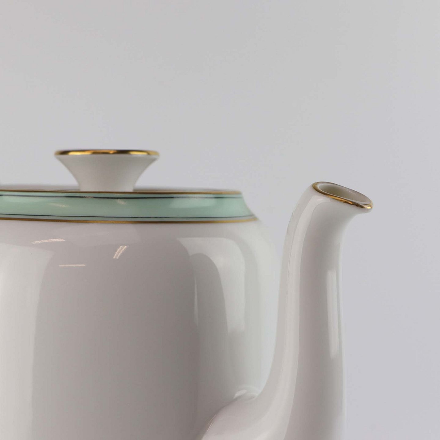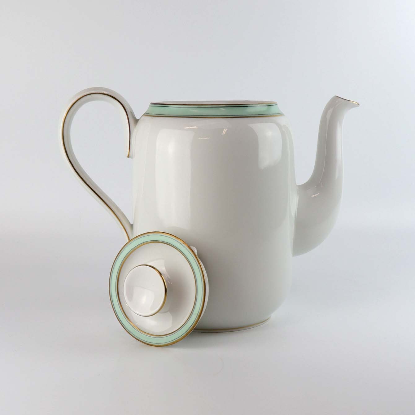 Service i glat hvidt porcelæn med mintblå dekoration og dobbelte guldkanter
