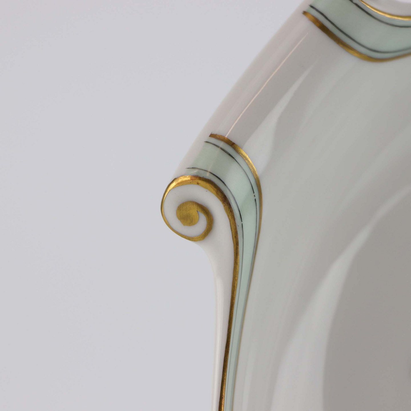 Service i glat hvidt porcelæn med mintblå dekoration og dobbelte guldkanter