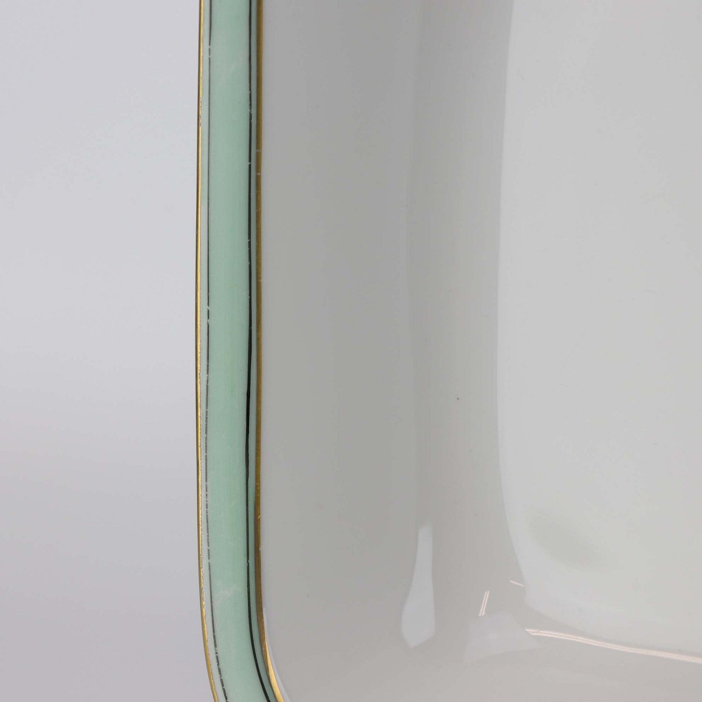 Service i glat hvidt porcelæn med mintblå dekoration og dobbelte guldkanter