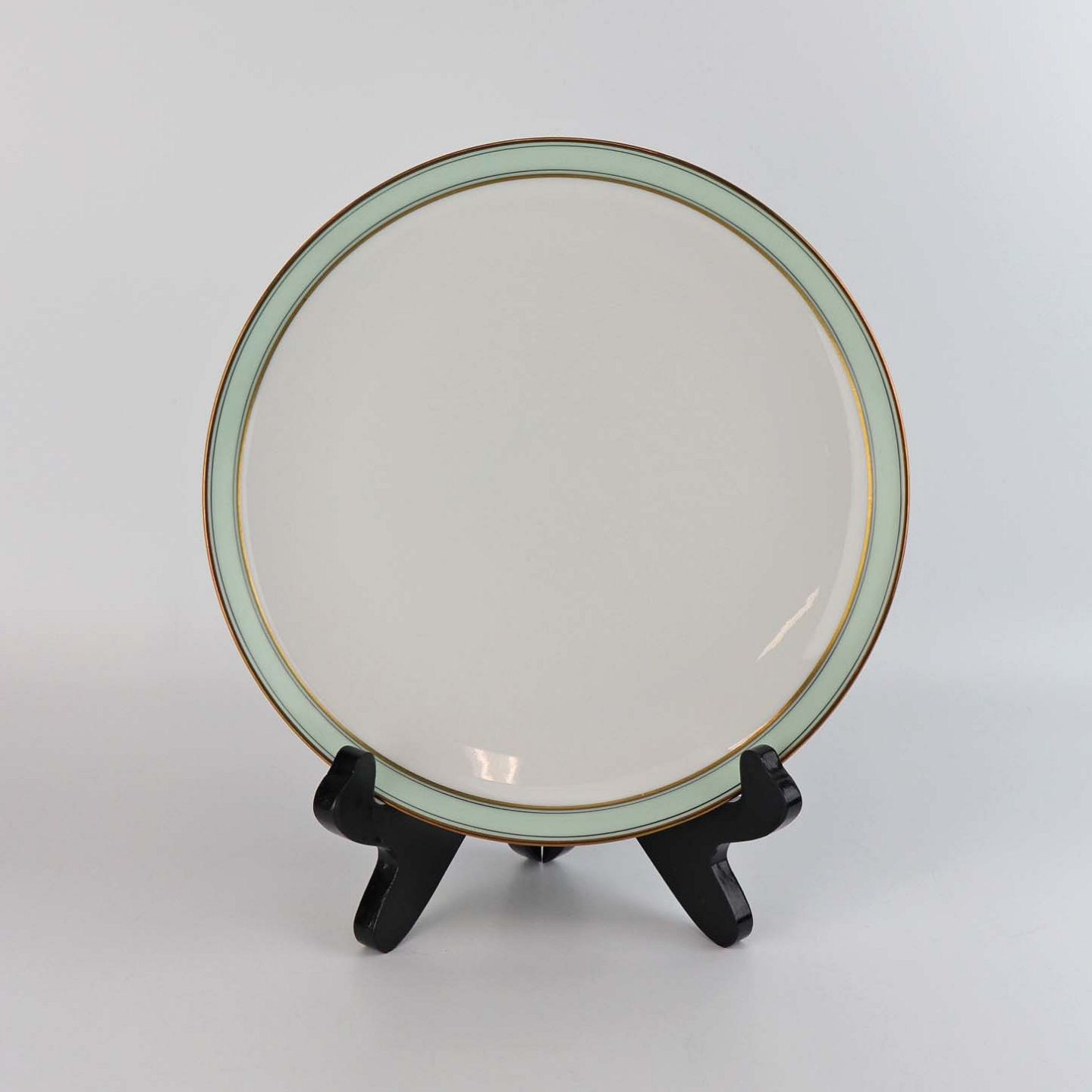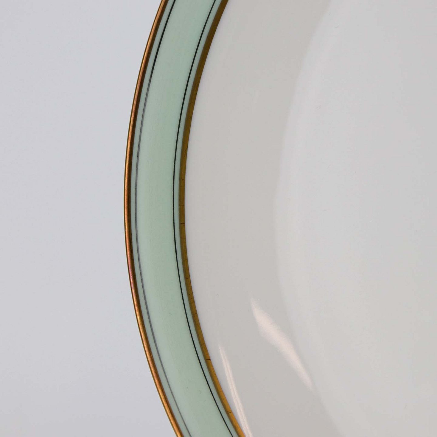 Service i glat hvidt porcelæn med mintblå dekoration og dobbelte guldkanter