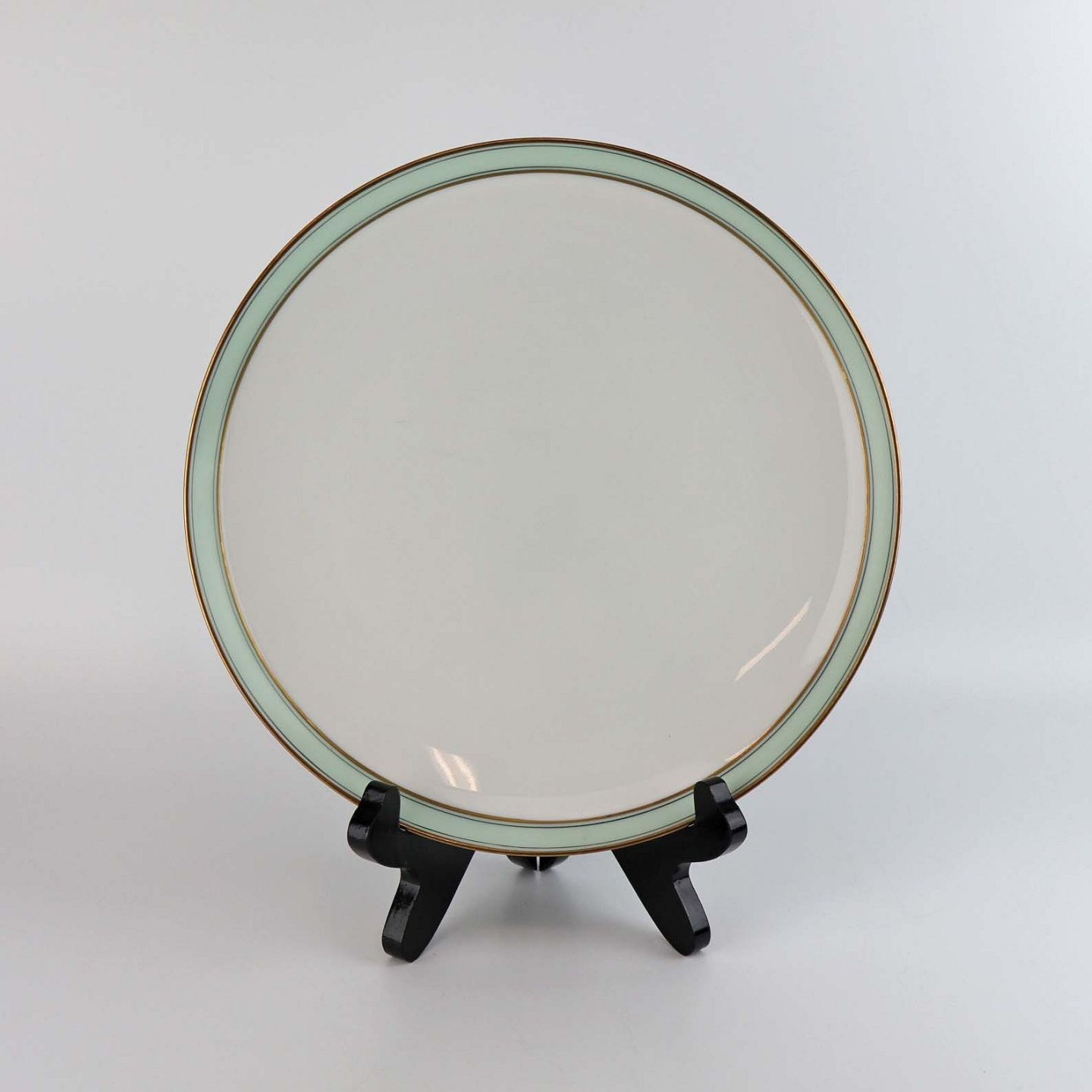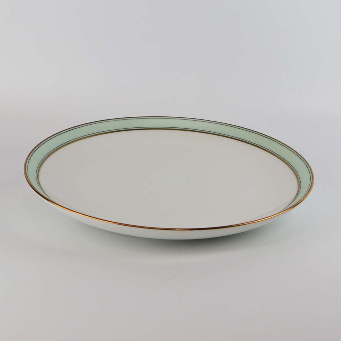 Service i glat hvidt porcelæn med mintblå dekoration og dobbelte guldkanter