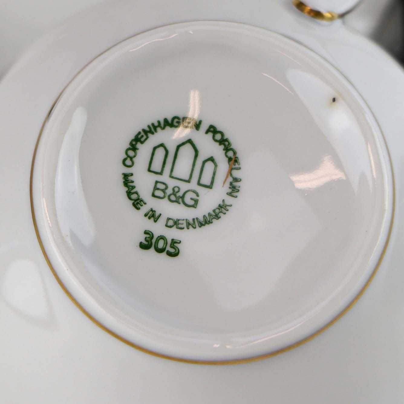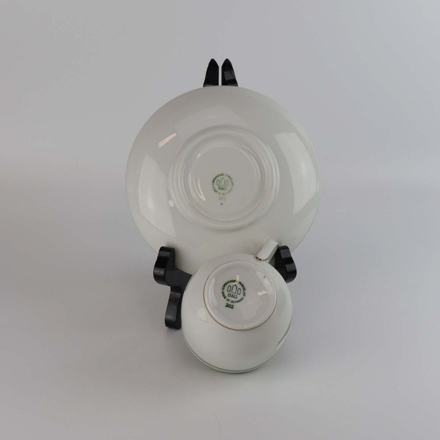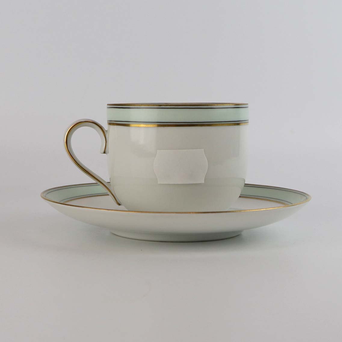 Service i glat hvidt porcelæn med mintblå dekoration og dobbelte guldkanter