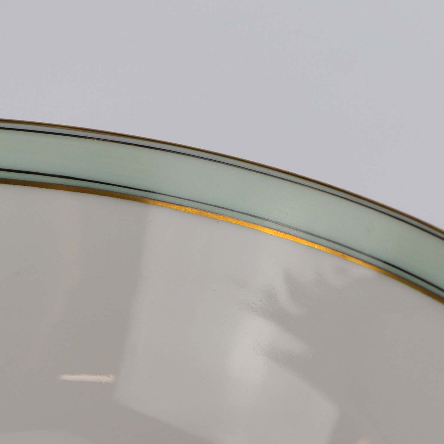 Service i glat hvidt porcelæn med mintblå dekoration og dobbelte guldkanter