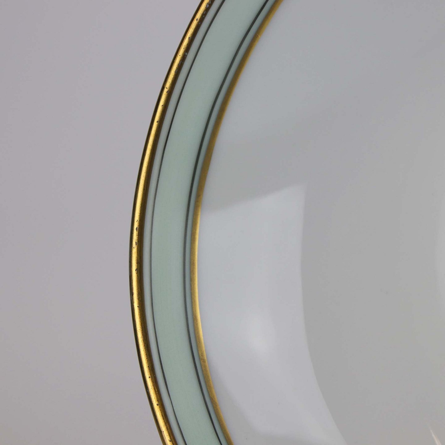 Service i glat hvidt porcelæn med mintblå dekoration og dobbelte guldkanter