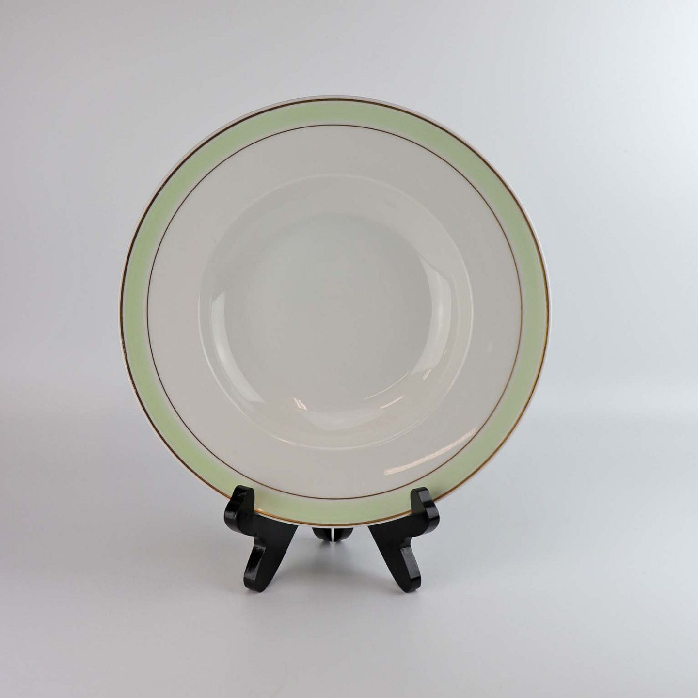Service i glat hvidt porcelæn med mintgrøn dekoration og to guldkanter