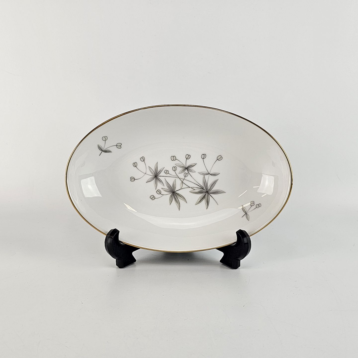 Stellet Henrik er af hvidt porcelæn dekoreret med grå burresnerre og guldkant. Mindre brugsspor kan forekomme