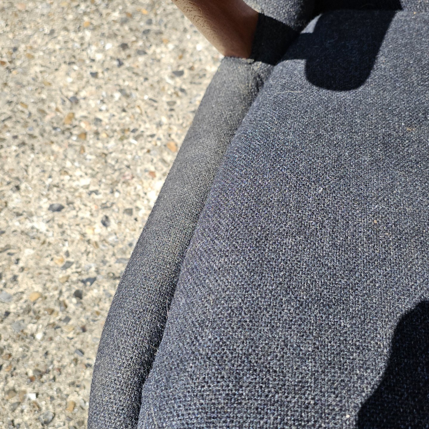 Sæde og ryglæn beklædt med gråt stof, der ikke er i god stand