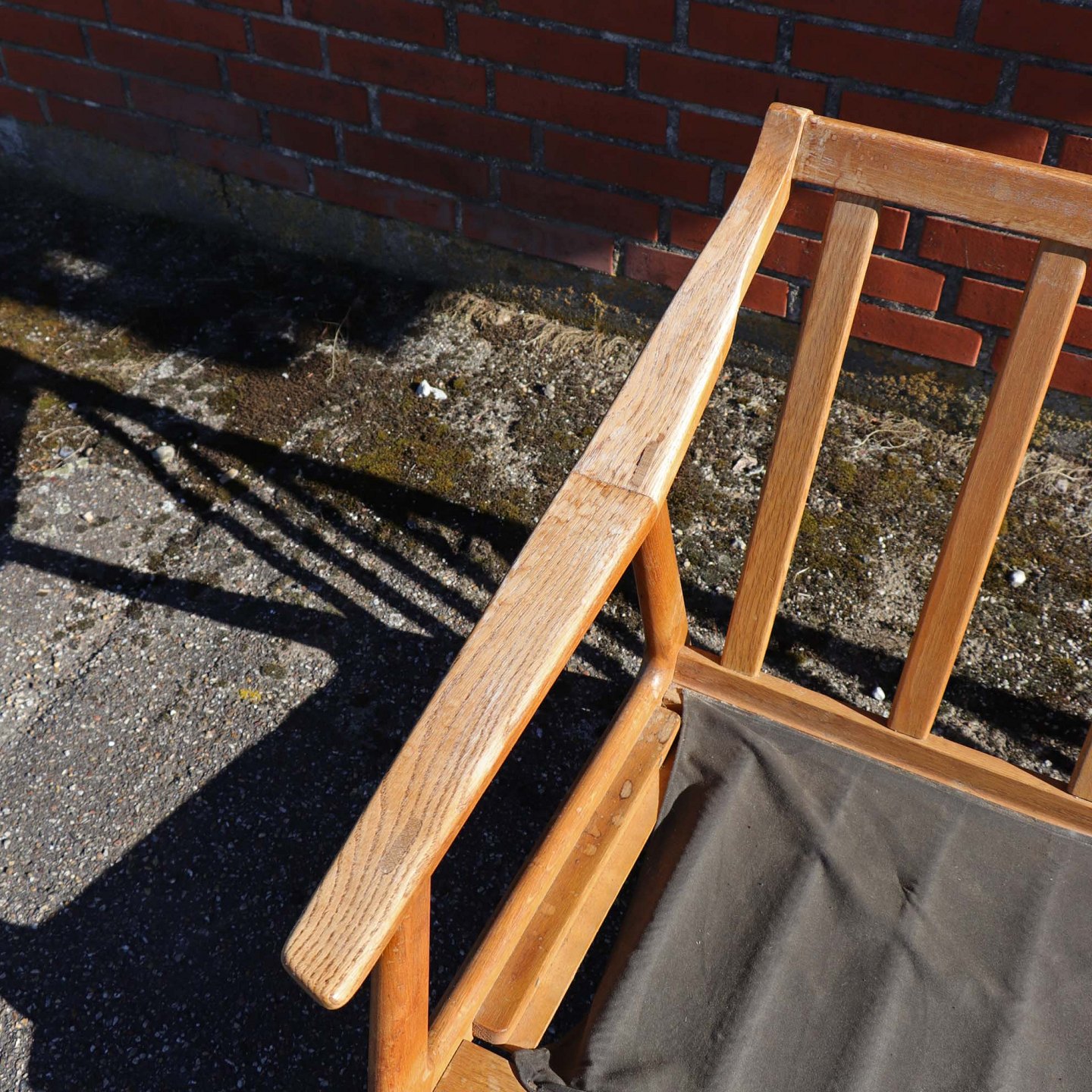 Fremstår med brugsspor som vandmærker, slid på lak og mindre hul i stof ved bunden.