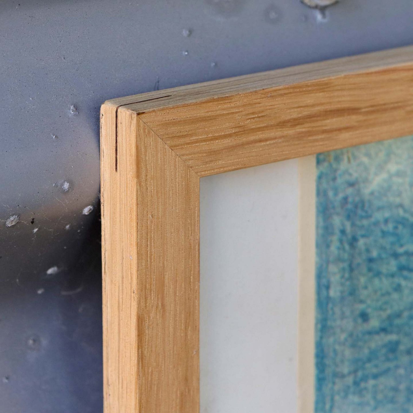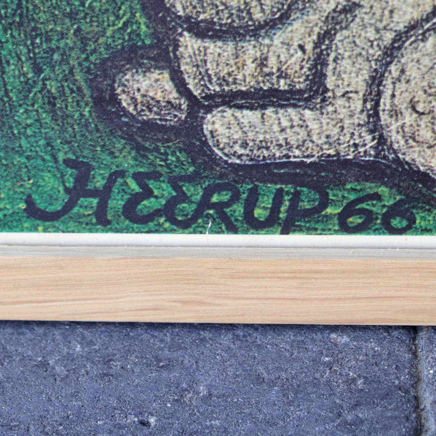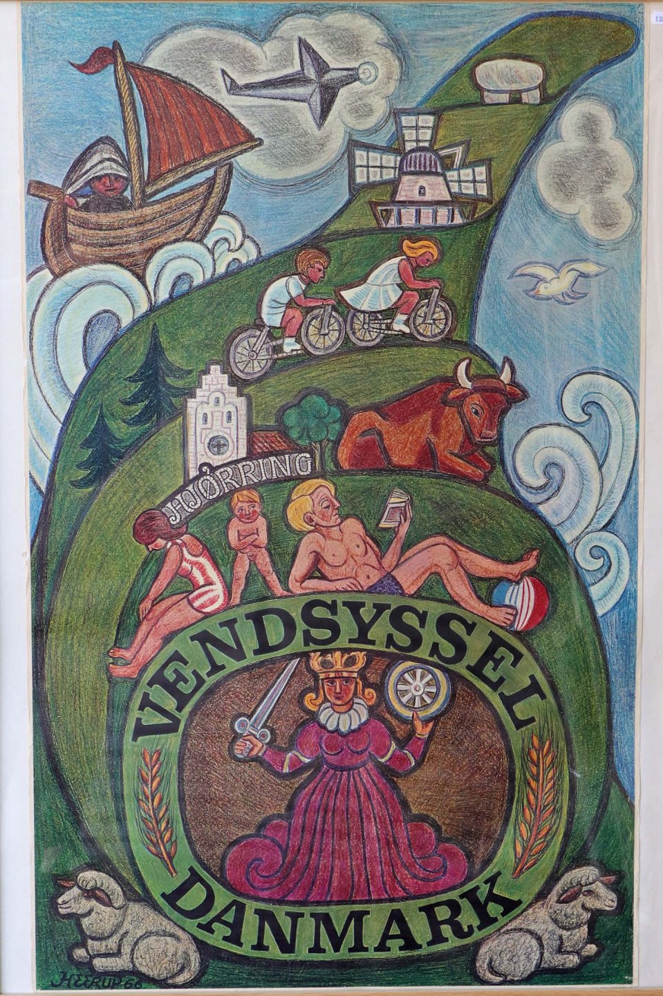 Indrammet grafisk tryk i træramme med plast fortsats og motiv af vendsyssel området. Trykket indeholder flere farverige motiver af både dyr og mennesker.
