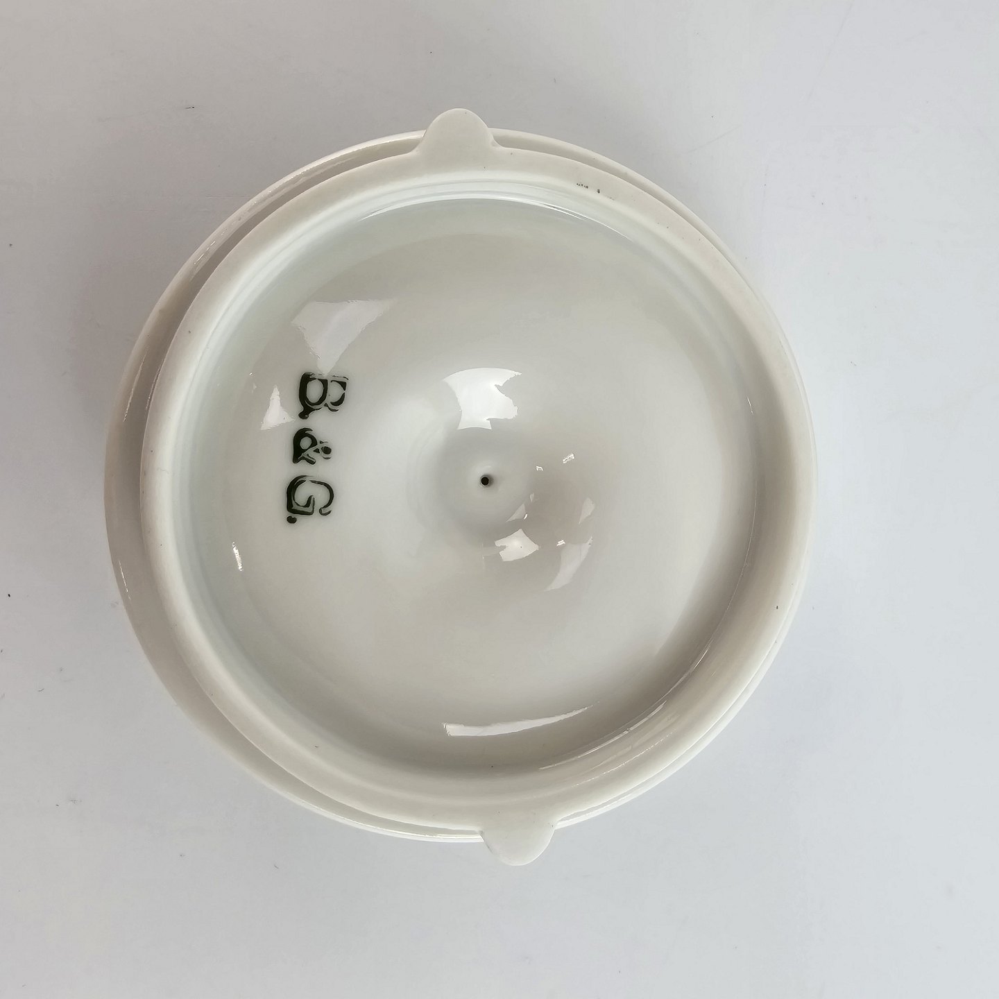 Hasselnød er hvidt porcelæn dekoreret med guldfarvet nødder, grønne blade samt et lys grønt bånd og guldkant. Brugsspor kan forekomme