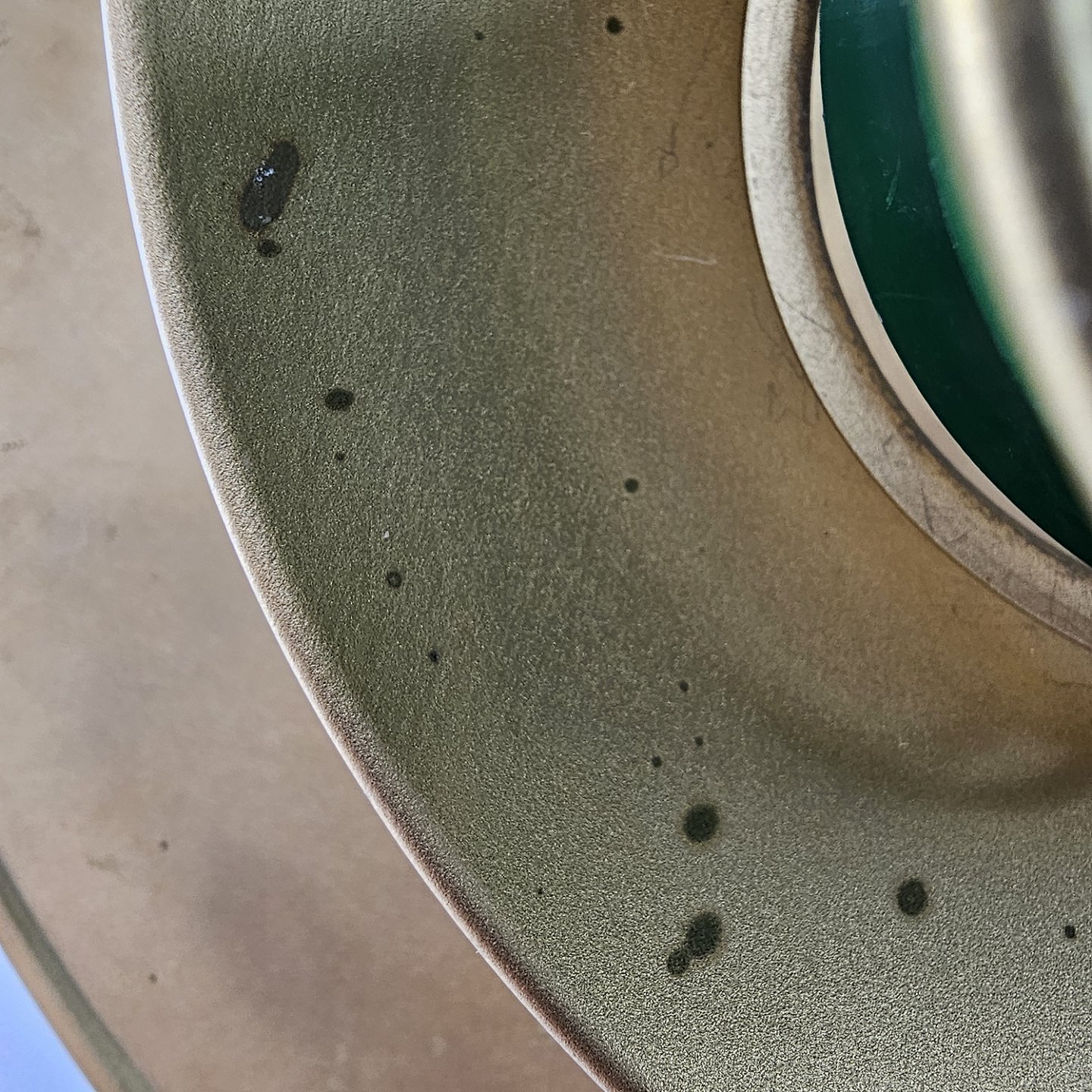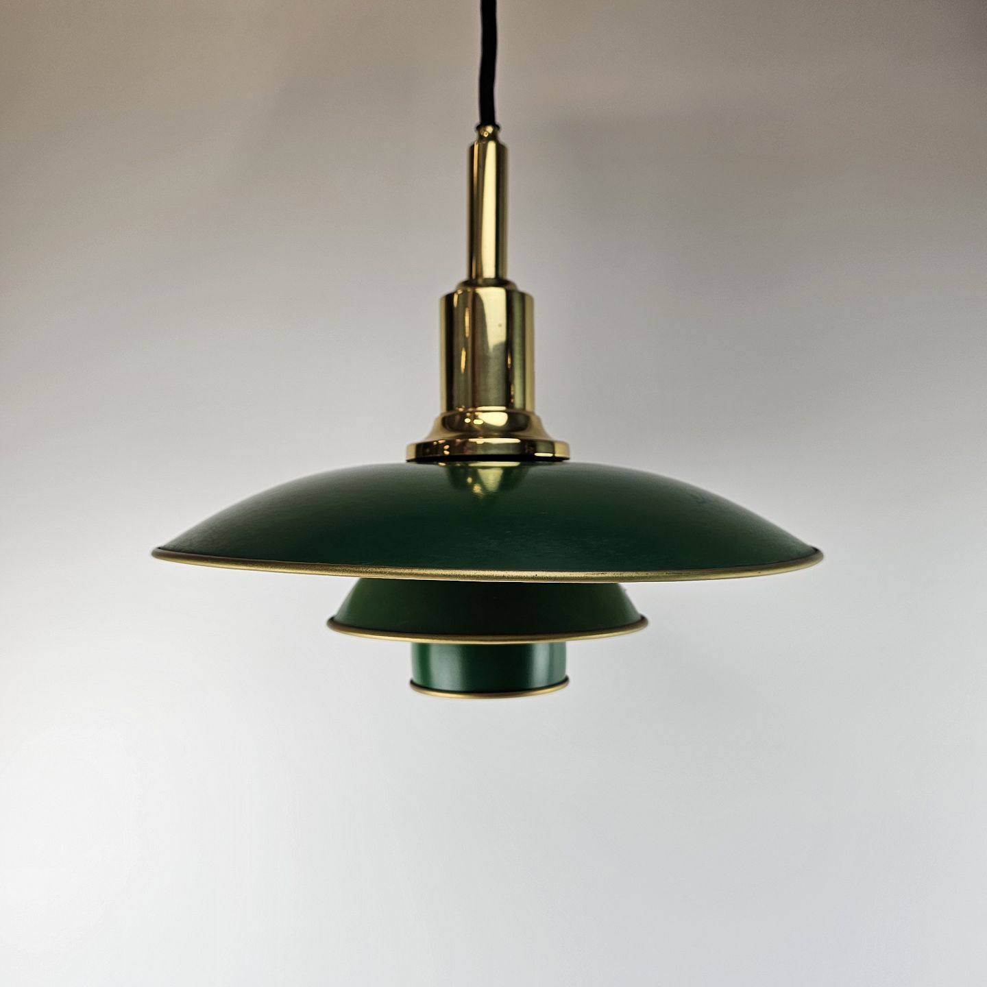 Loftlampe i messing med skærme lakeret grøn. Jubilæumspendel. Stofledning i sort, mindre brugsspor indvendigt