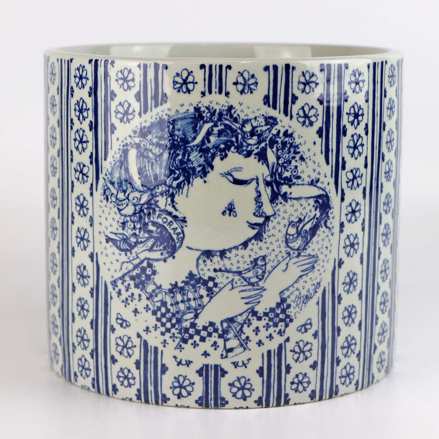 Urtepotteskjuler i porcelæn med motiv i blå streg af kvinde med fugl på hånd med titlen Foraar. Nr. 3024-699