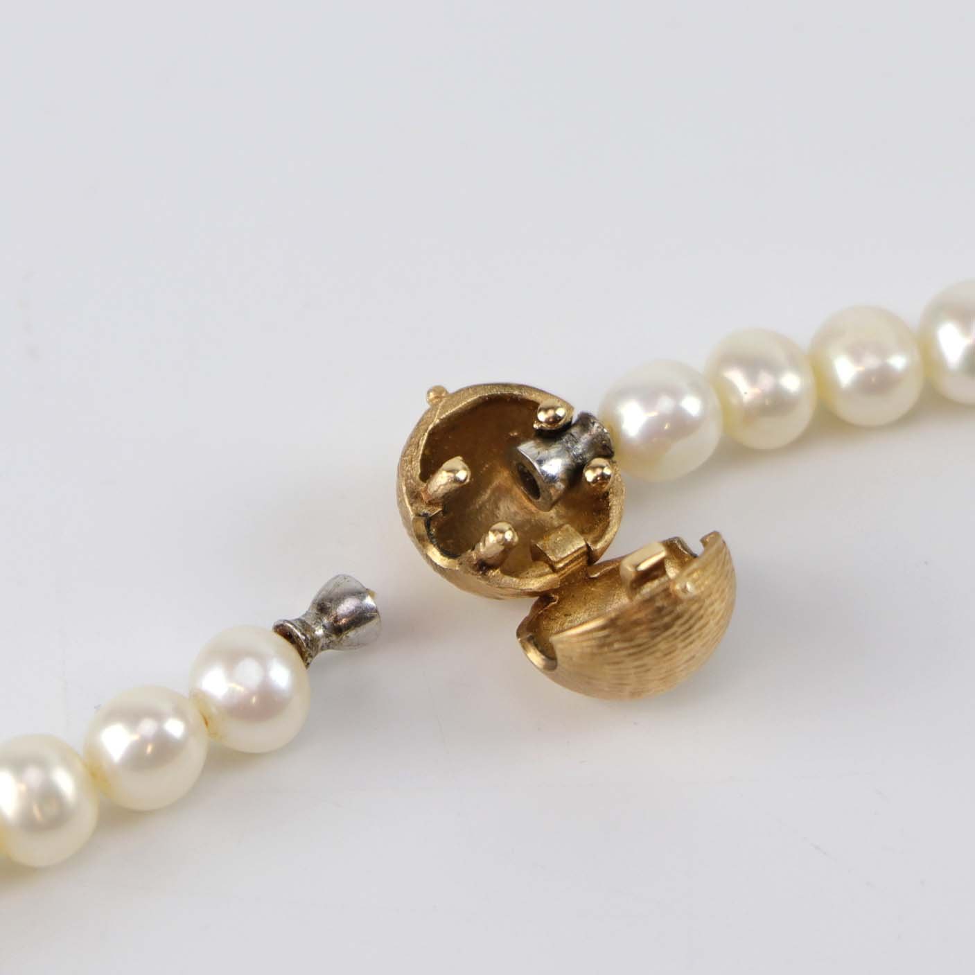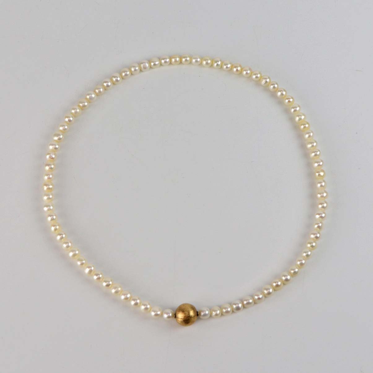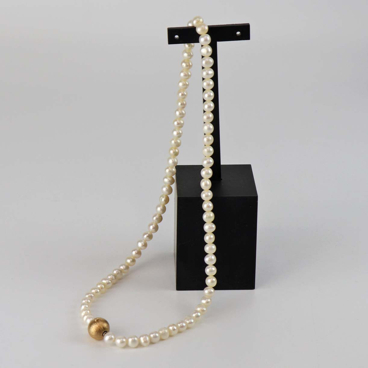 Halskæde med lyse ferskvands kulturperler og rund kuglelås i 14 karat guld. Perlekæden kommer med original æske.