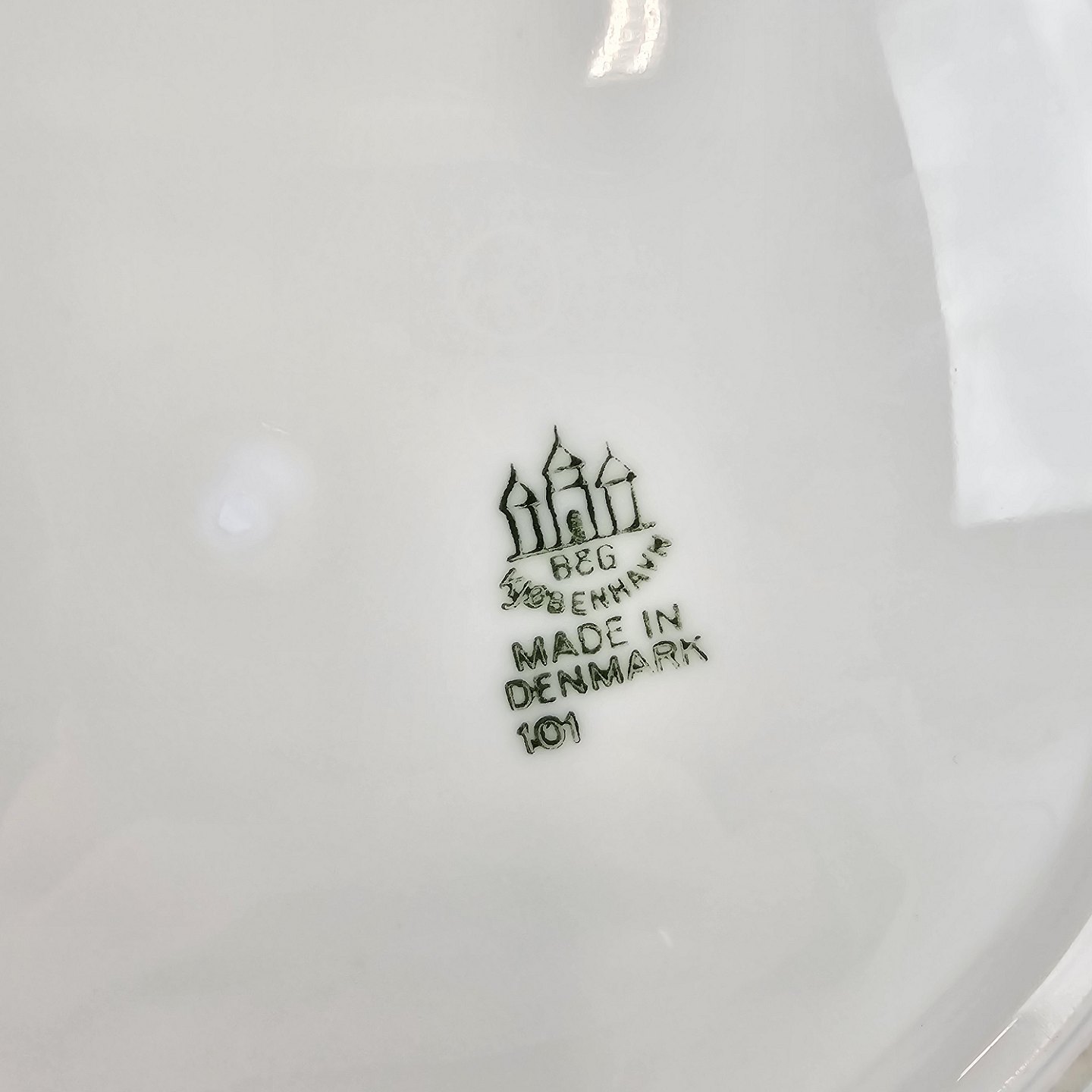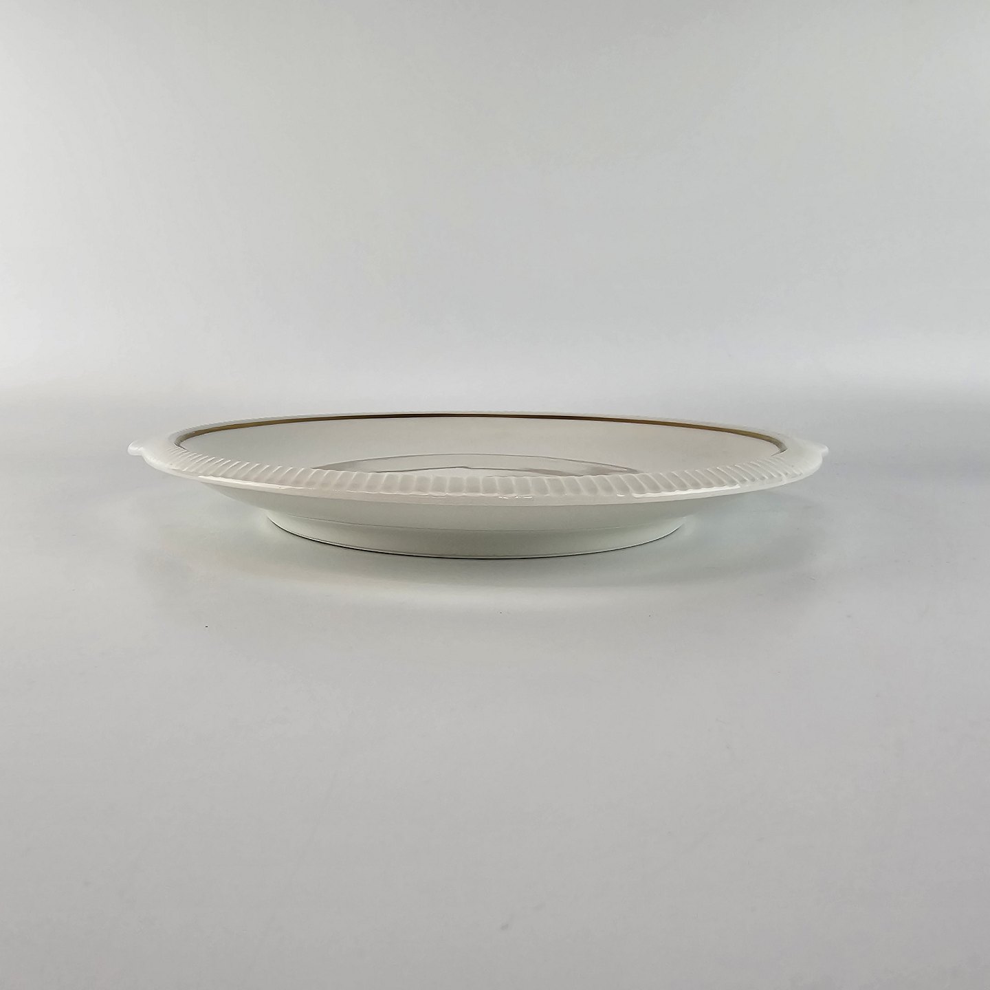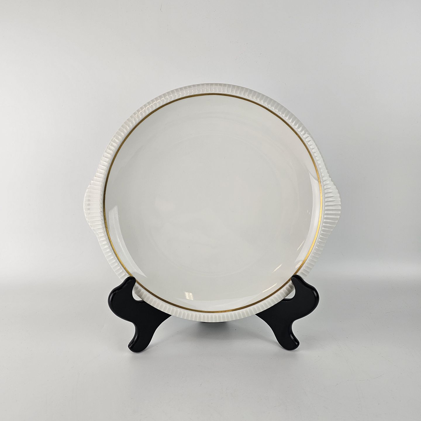 Vega er hvidt porcelæn med guldkant. Tallerkener og fade er dekoreret med riller i kanten. Kan fremstår med brugsspor