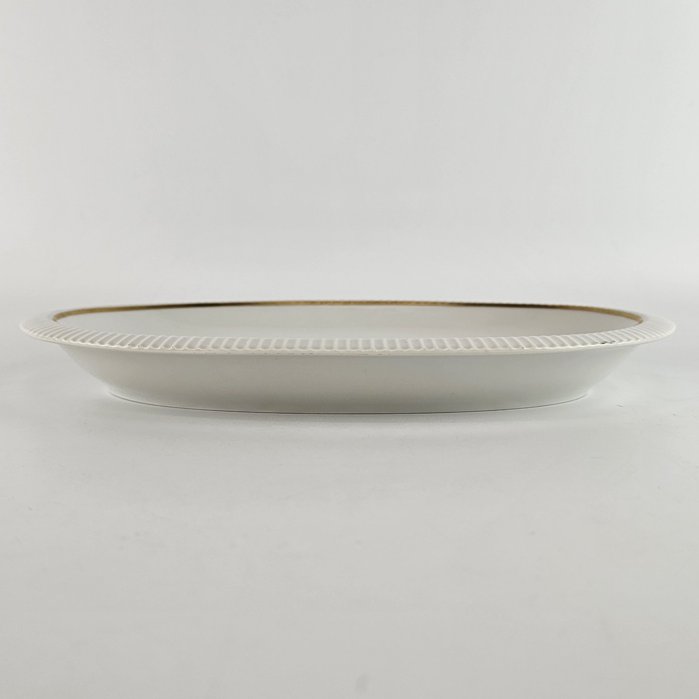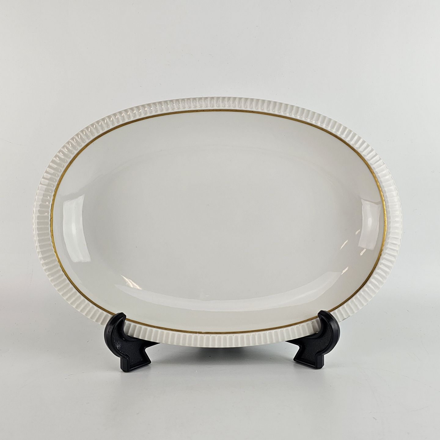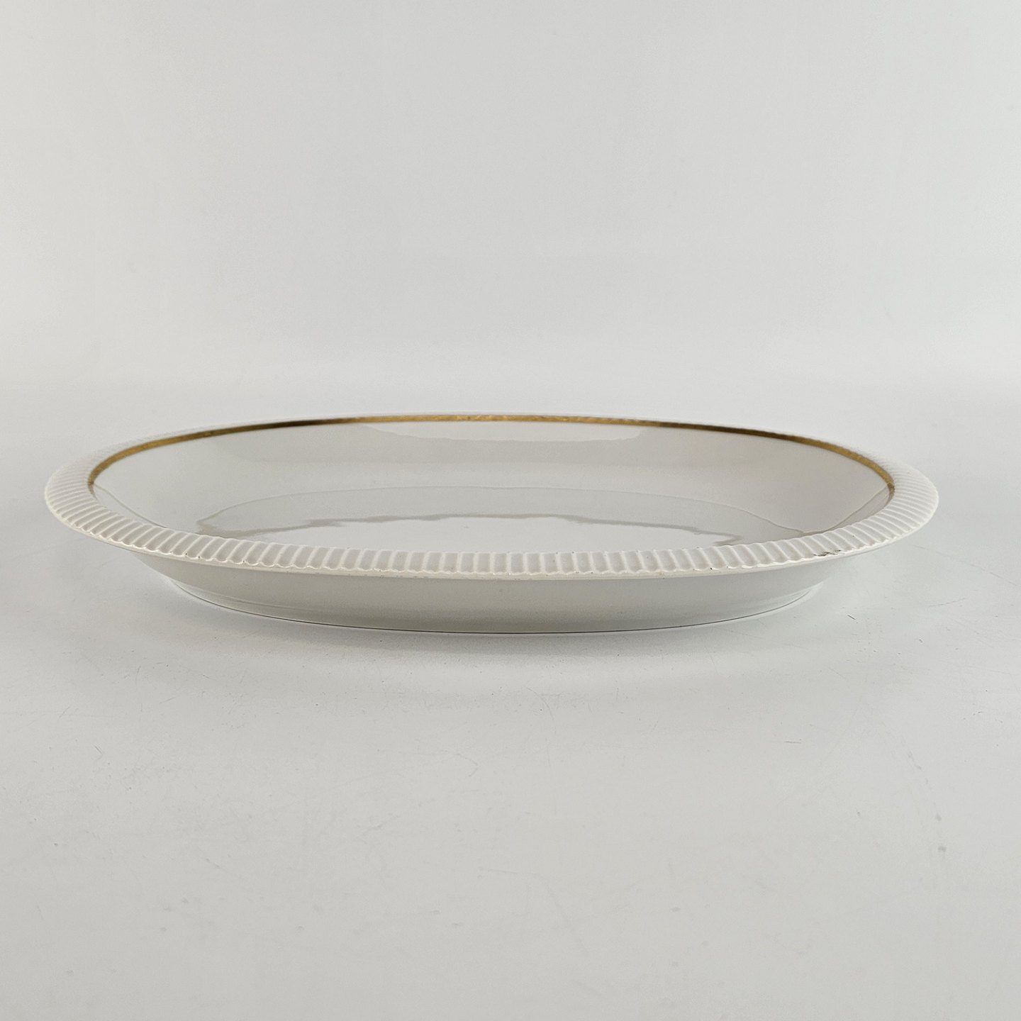 Vega er hvidt porcelæn med guldkant. Tallerkener og fade er dekoreret med riller i kanten. Kan fremstår med brugsspor