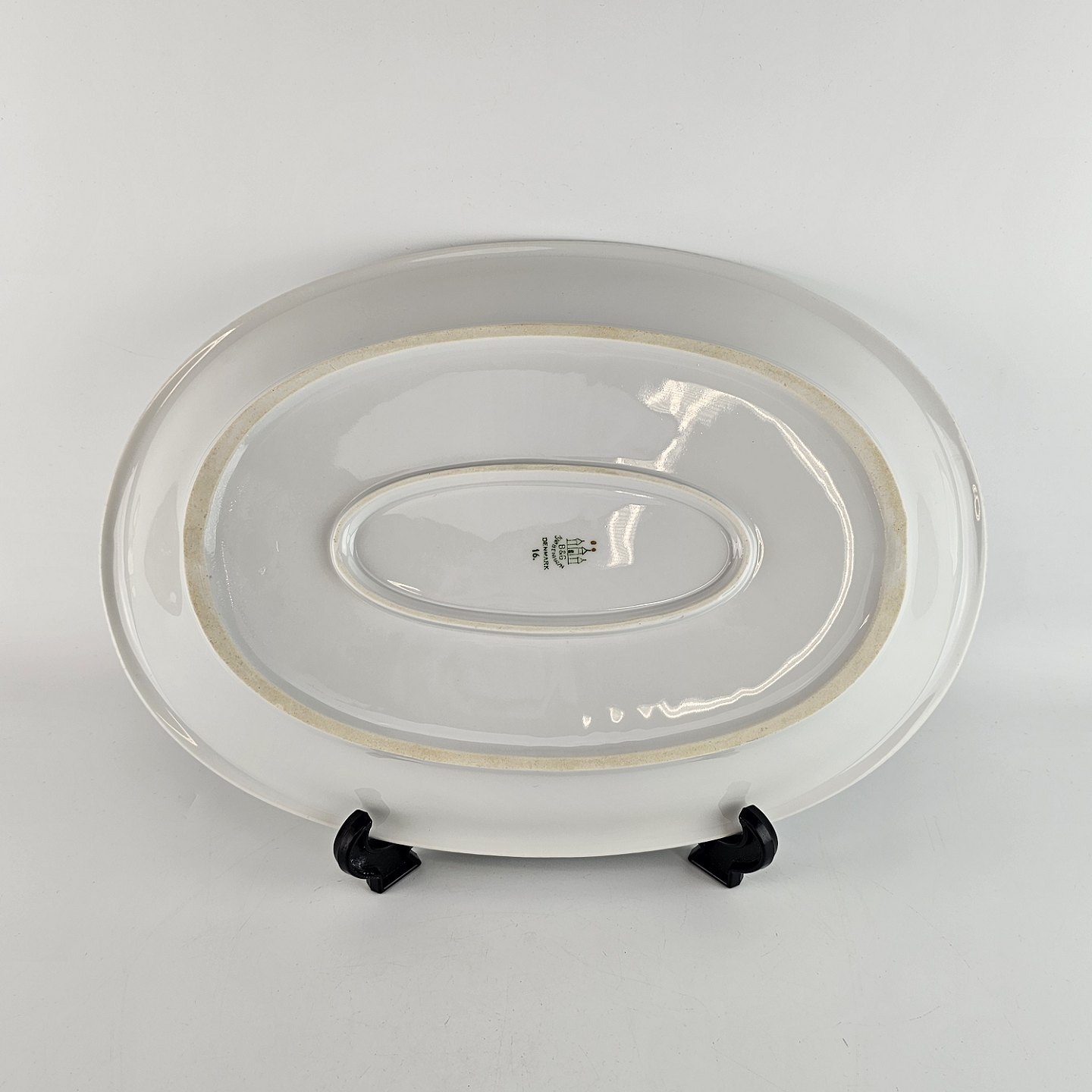 Vega er hvidt porcelæn med guldkant. Tallerkener og fade er dekoreret med riller i kanten. Kan fremstår med brugsspor