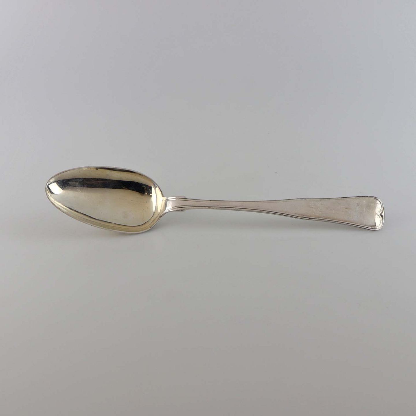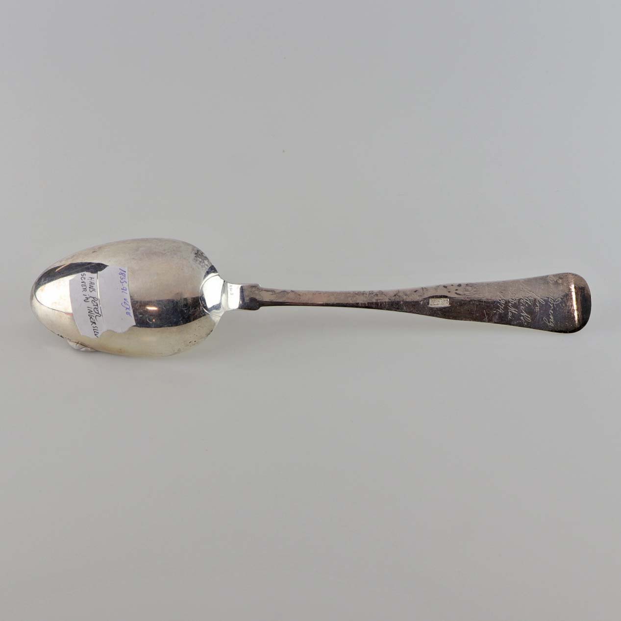 Antik riflet spiseske i sølv fra 1800 tallet med teksten Erindring fra N.J.N d. 23 maj 1874