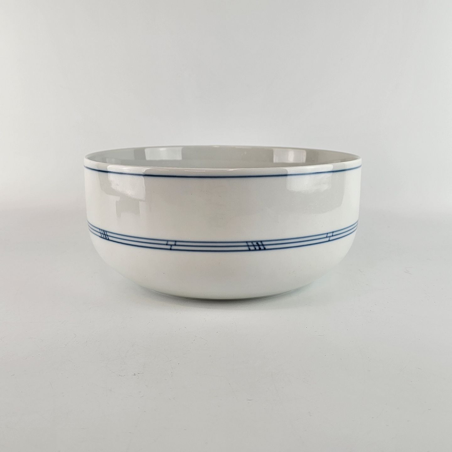 Delfi er hvidt glaseret porcelæn, dekoreret med tynde blå striber. Lettere brugsspor kan forekomme.