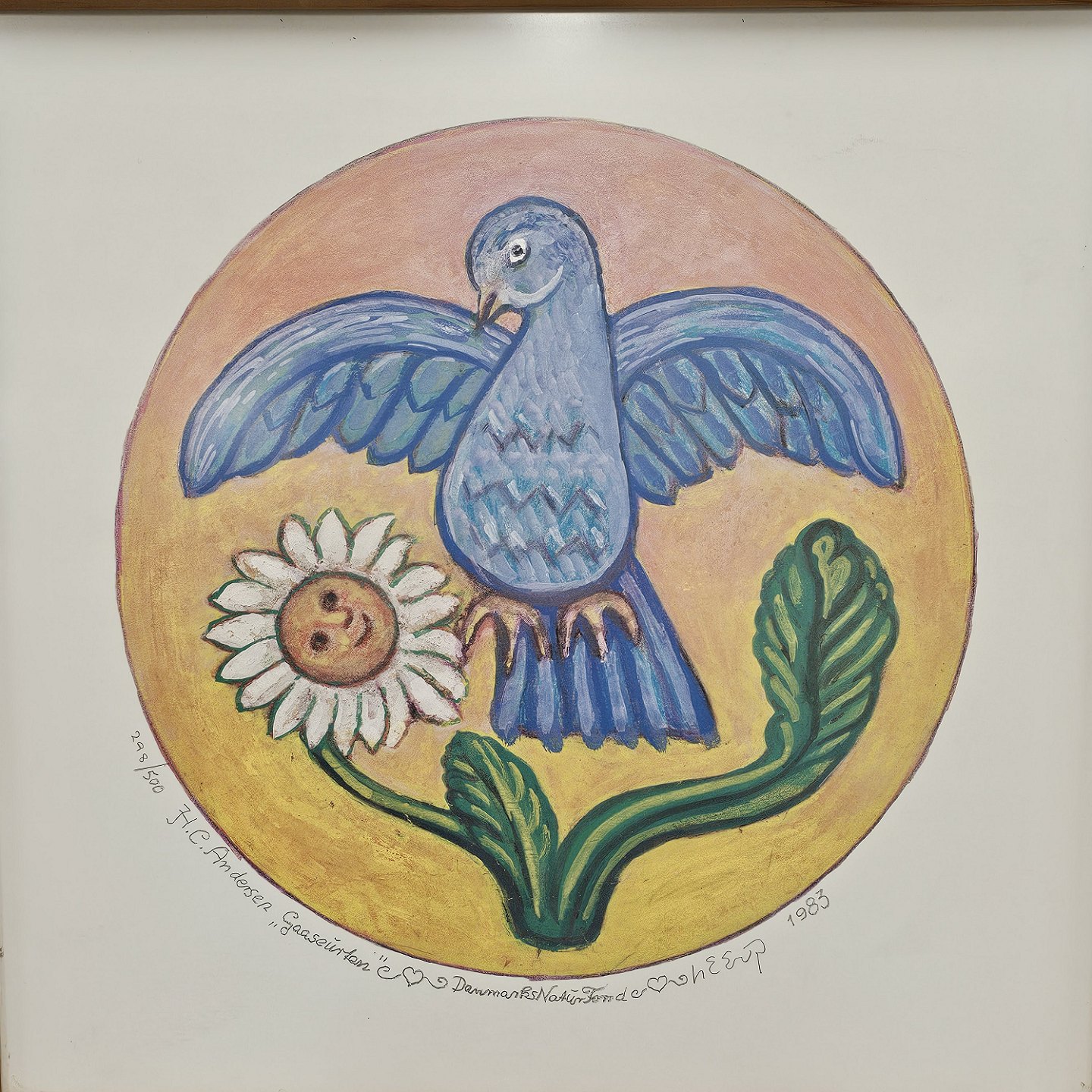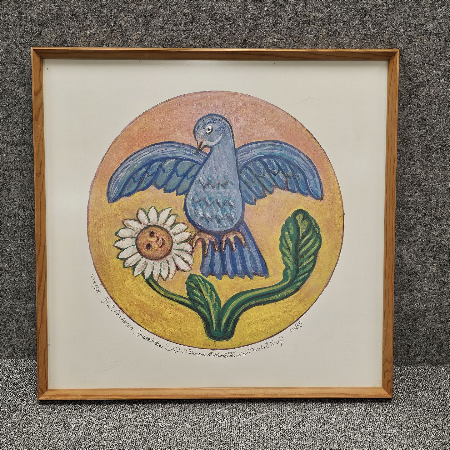 Indrammet litografi i træramme. Motivet er fra H.C Andersens fortælling om Gåseurten og er fremstillet i samarbejde med Danmarks naturfonden i 1983. Nummer 298 ud af 500 eksemplarer.